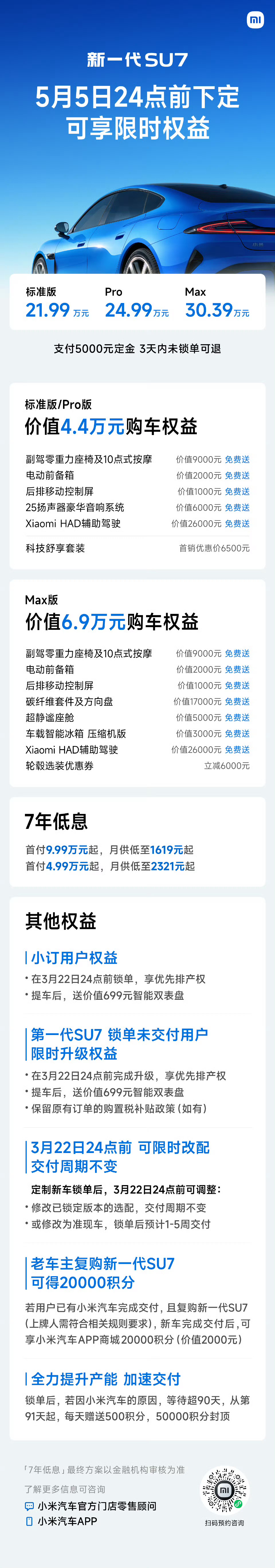 小米新SU7起售价21.99万元新一代SU7正式定价21.99万起,比预售价还便宜1万!虽然比老款涨了4000块,但激光雷达、V6s Plus电机、9气囊、超强钢、底盘升级全给你标配,一百多项升级直接拉满。