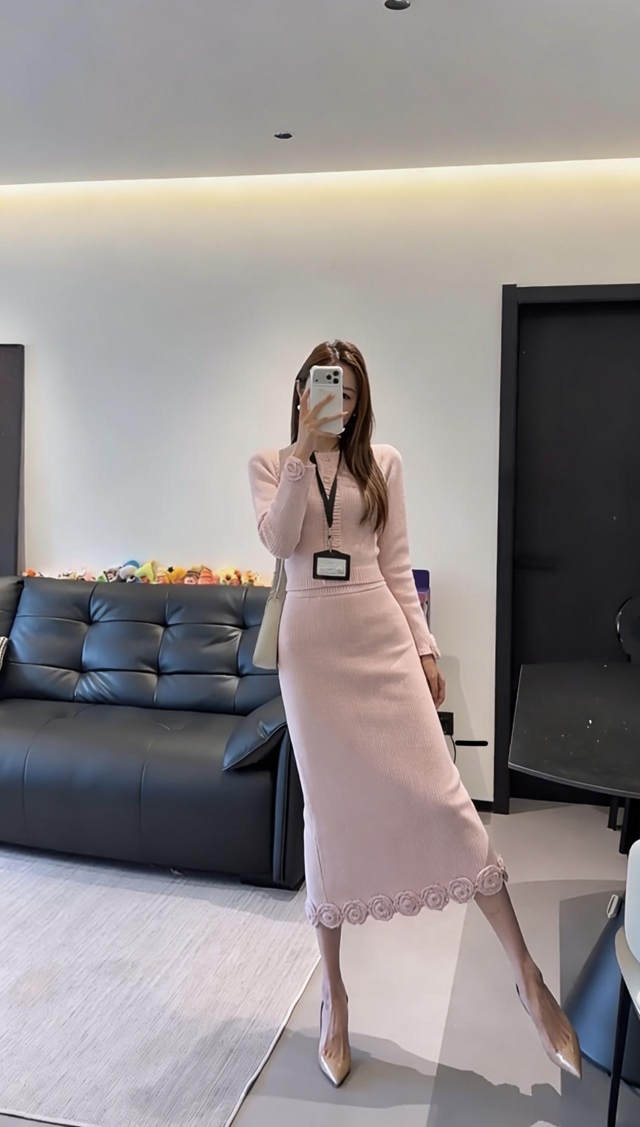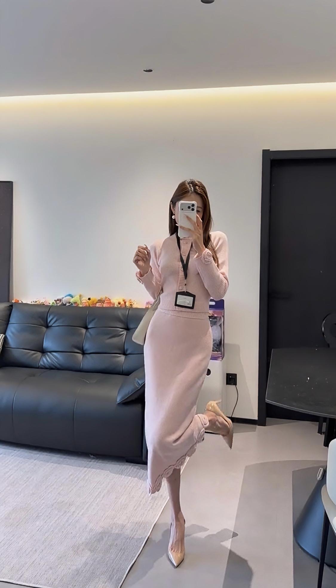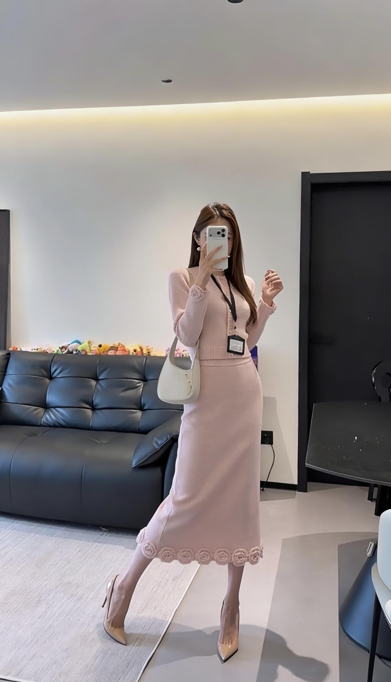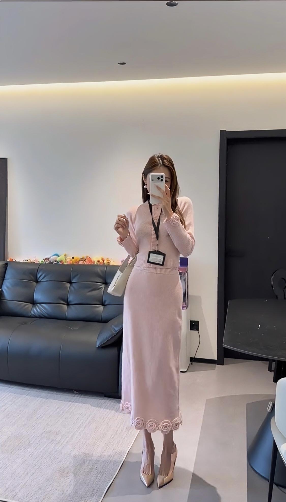 正常穿搭推荐,无不良引导。 今日推荐穿搭整体风格:温柔知性风,兼具优雅与通勤感,是很适合日常的气质款。 • 上衣:浅粉色圆领针织开衫,半开襟纽扣设计+袖口立体玫瑰装饰,修身短款版型能优化身材比例,针织纹理细腻,温柔又有质感。 • 下装:同色系针织直筒长裙,裙摆边缘也点缀了立体玫瑰花纹,和上衣呼应,长度到小腿中部,既修饰腿型又保留了优雅感。 • 配饰:珍珠耳饰+浅杏色腋下包+裸色尖头细跟鞋,搭配工牌挂绳,整体色调统一柔和,精致又不张扬。 ✨ 适合的场合 1. 职场通勤:温柔得体,不会过于张扬,是办公室里很讨喜的风格。 2. 日常约会/下午茶:粉色调自带温柔氛围,针织材质舒适亲肤,很适合和朋友小聚、约会拍照,出片温柔又有氛围感。 3. 轻商务场合:比如客户见面、小型会议,这套穿搭既正式又不会显得刻板,能传递专业又亲和的印象。 4. 周末出行:搭配平底鞋可切换为休闲感,适合逛展、探店等轻松场景,舒适又好看。 💡 小Tips • 想更活泼:可以搭配白色贝雷帽或浅色系围巾,增加少女感。 • 想更干练:换一双黑色尖头鞋,整体会更偏向职场利落感。
