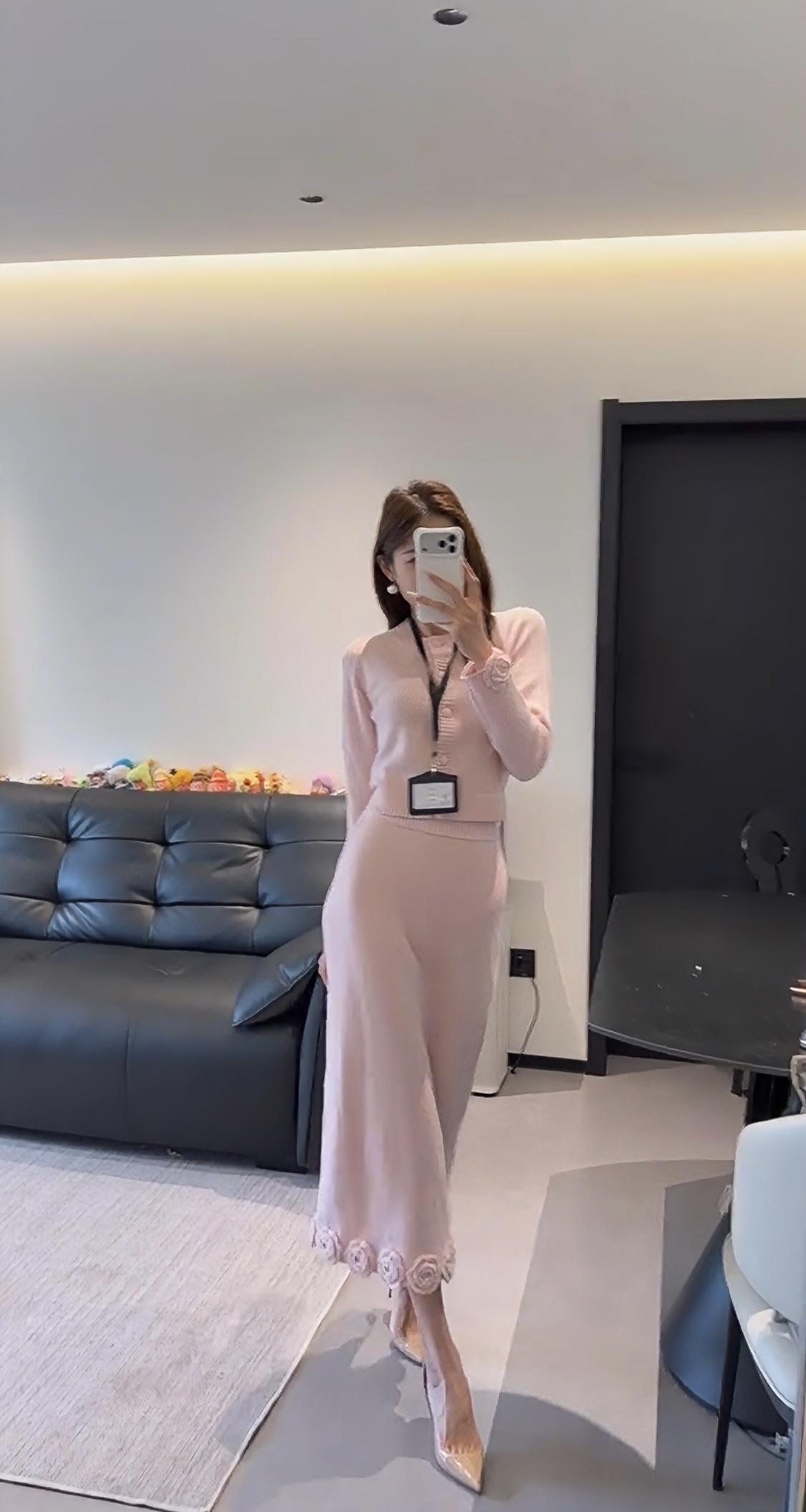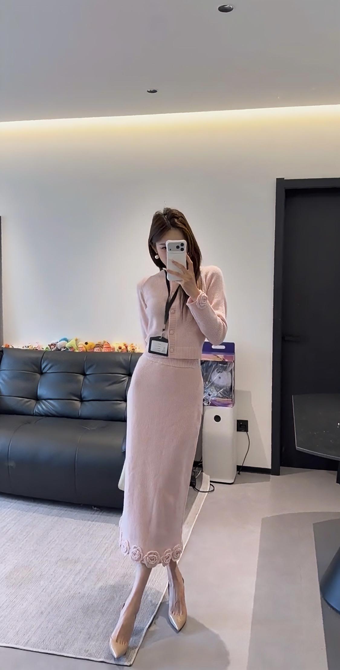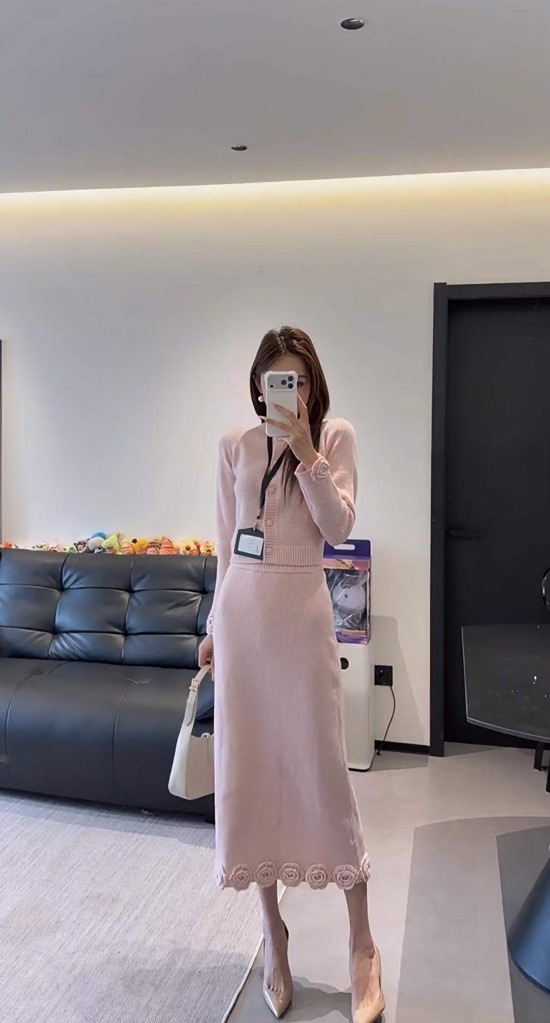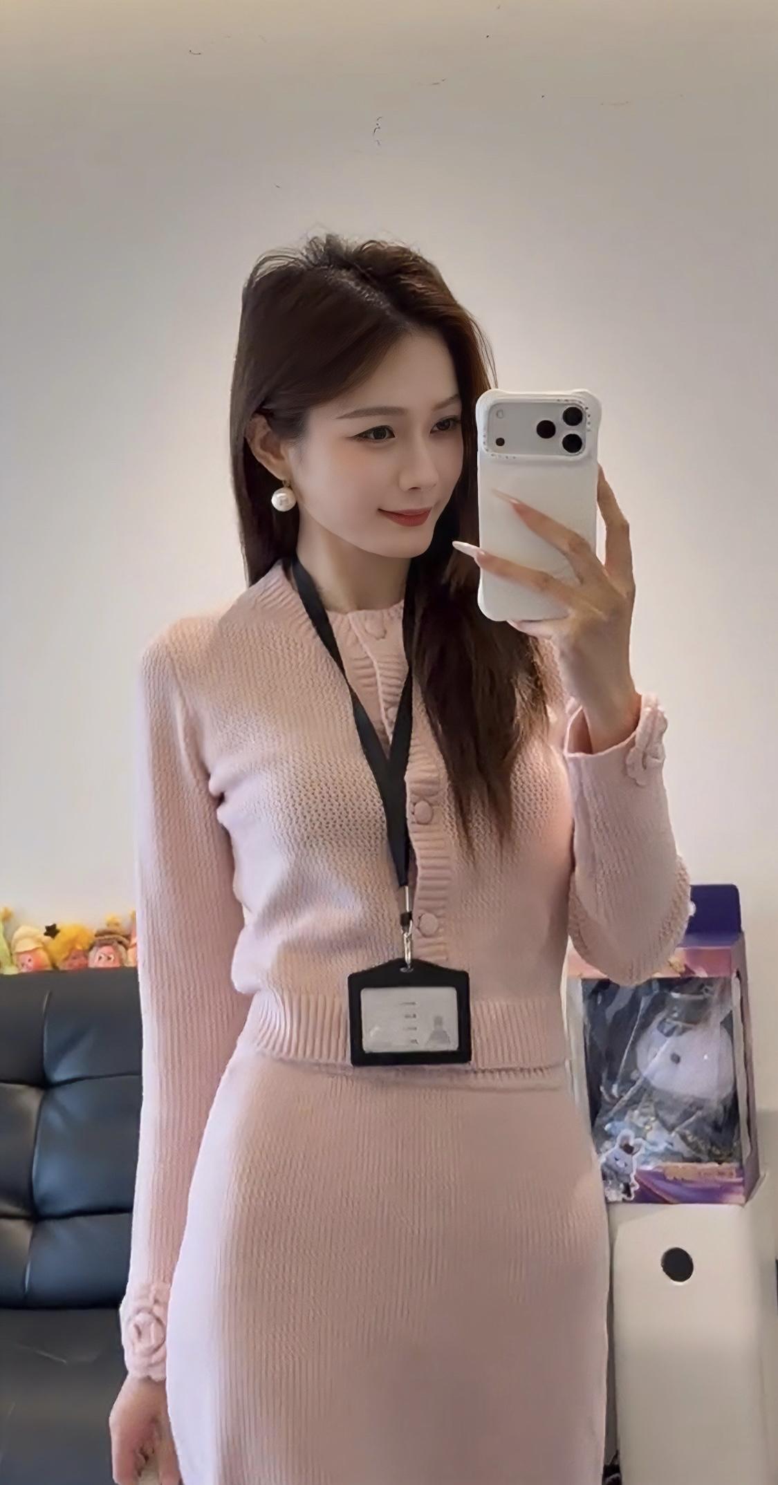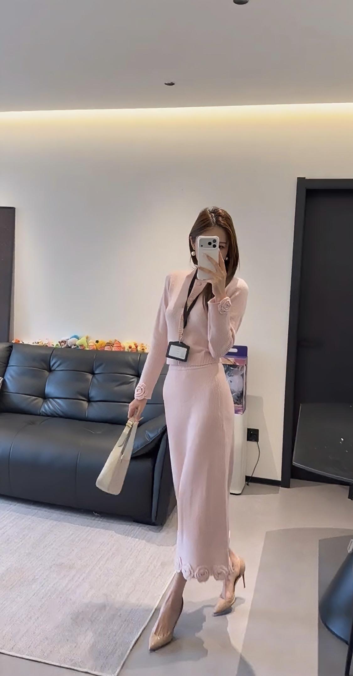 正常穿搭推荐,无不良引导。 今日推荐穿搭整体风格:温柔知性风,兼具优雅与通勤感,是很适合日常的气质款。 • 上衣:浅粉色圆领针织开衫,半开襟纽扣设计+袖口立体玫瑰装饰,修身短款版型能优化身材比例,针织纹理细腻,温柔又有质感。 • 下装:同色系针织直筒长裙,裙摆边缘也点缀了立体玫瑰花纹,和上衣呼应,长度到小腿中部,既修饰腿型又保留了优雅感。 • 配饰:珍珠耳饰+浅杏色腋下包+裸色尖头细跟鞋,搭配工牌挂绳,整体色调统一柔和,精致又不张扬。 ✨ 适合的场合 1. 职场通勤:温柔得体,不会过于张扬,是办公室里很讨喜的风格。 2. 日常约会/下午茶:粉色调自带温柔氛围,针织材质舒适亲肤,很适合和朋友小聚、约会拍照,出片温柔又有氛围感。 3. 轻商务场合:比如客户见面、小型会议,这套穿搭既正式又不会显得刻板,能传递专业又亲和的印象。 4. 周末出行:搭配平底鞋可切换为休闲感,适合逛展、探店等轻松场景,舒适又好看。 💡 小Tips • 想更活泼:可以搭配白色贝雷帽或浅色系围巾,增加少女感。 • 想更干练:换一双黑色尖头鞋,整体会更偏向职场利落感。