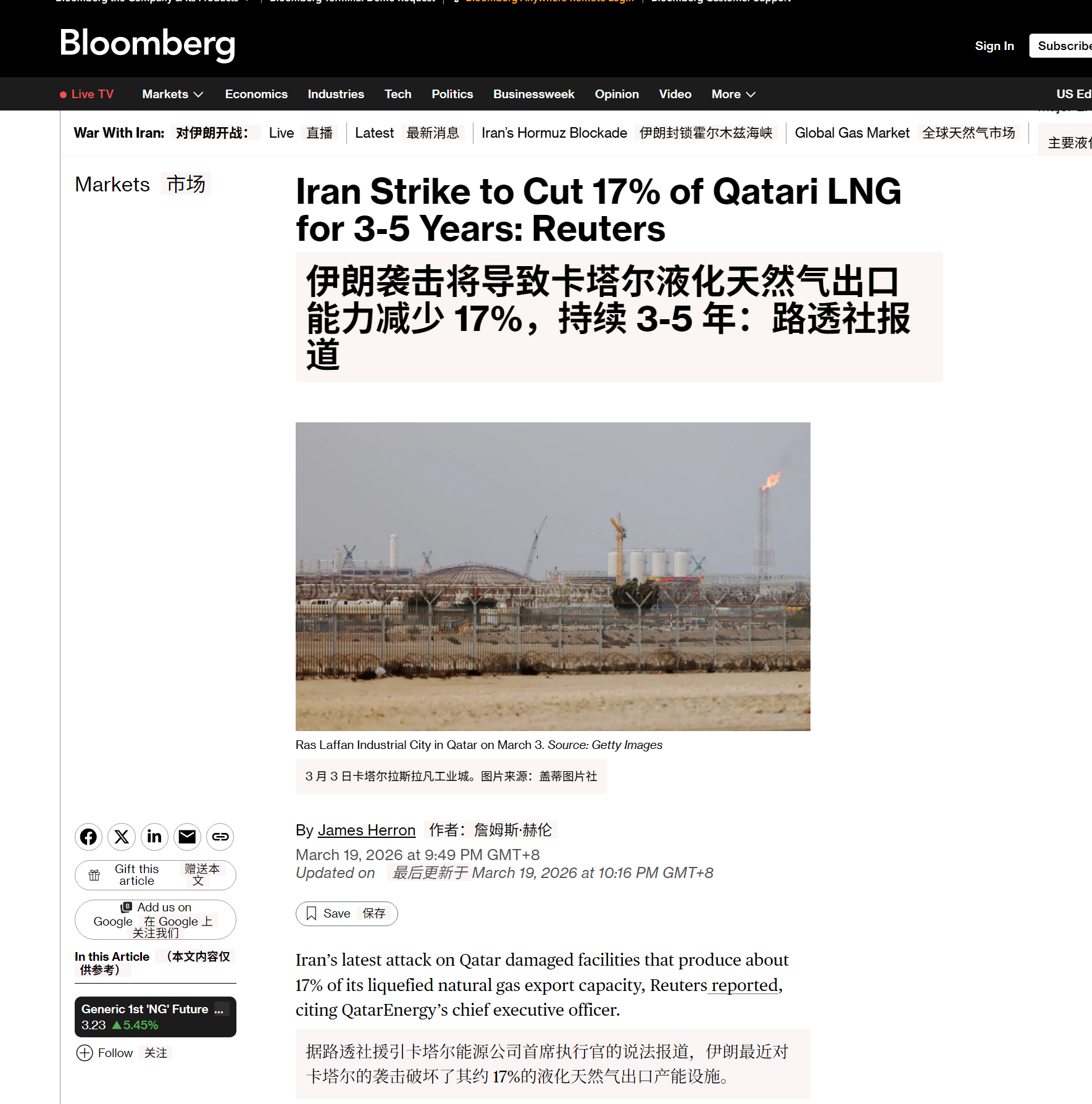 🔻据路透社援引卡塔尔能源公司首席执行官的说法报道,伊朗最近对卡塔尔的袭击破坏了其约 17%的液化天然气出口产能设施。🔻据该通讯社报道,首席执行官萨阿德·卡比表示,修复工作将需要三到五年时间。🔻此次袭击导致天然气价格飙升,欧洲期货价格周四早盘一度上涨 35%,达到战前水平的两倍多。伊朗外长回应美2000亿美元战争拨款伊朗发动第63波攻势海外新鲜事中东现场直击