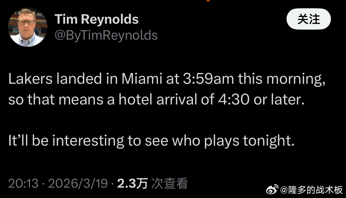 据报道,湖人全队于凌晨3:59飞抵迈阿密,抵达酒店的时间在4:30之后,不确定明天是否会有主力轮休。