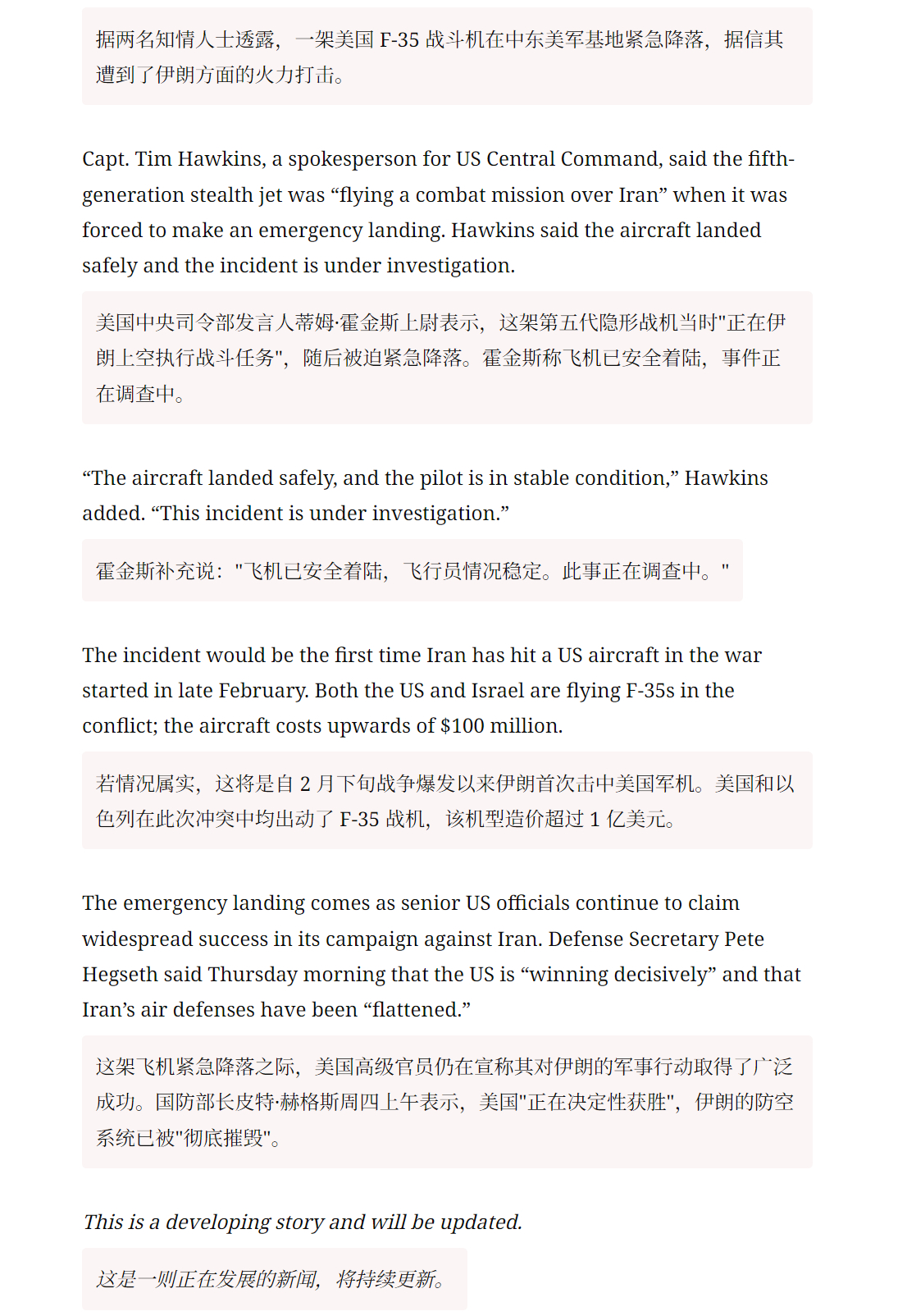 🔻突发新闻:一架美国 F-35 战斗机在中东美军基地紧急降落,据信其遭到了伊朗方面的火力打击。🔻若情况属实,这将是自 2 月下旬战争爆发以来伊朗首次击中 F-35。🔻这架飞机紧急降落之际,美国高级官员仍在宣称其对伊朗的军事行动取得了广泛成功。美国国防部长皮特·赫格斯周四上午表示,美国"正在决定性获胜",伊朗的防空系统已被"彻底摧毁"。🔻CNN 报道伊朗外长回应美2000亿美元战争拨款伊朗发动第63波攻势海外新鲜事中东现场直击