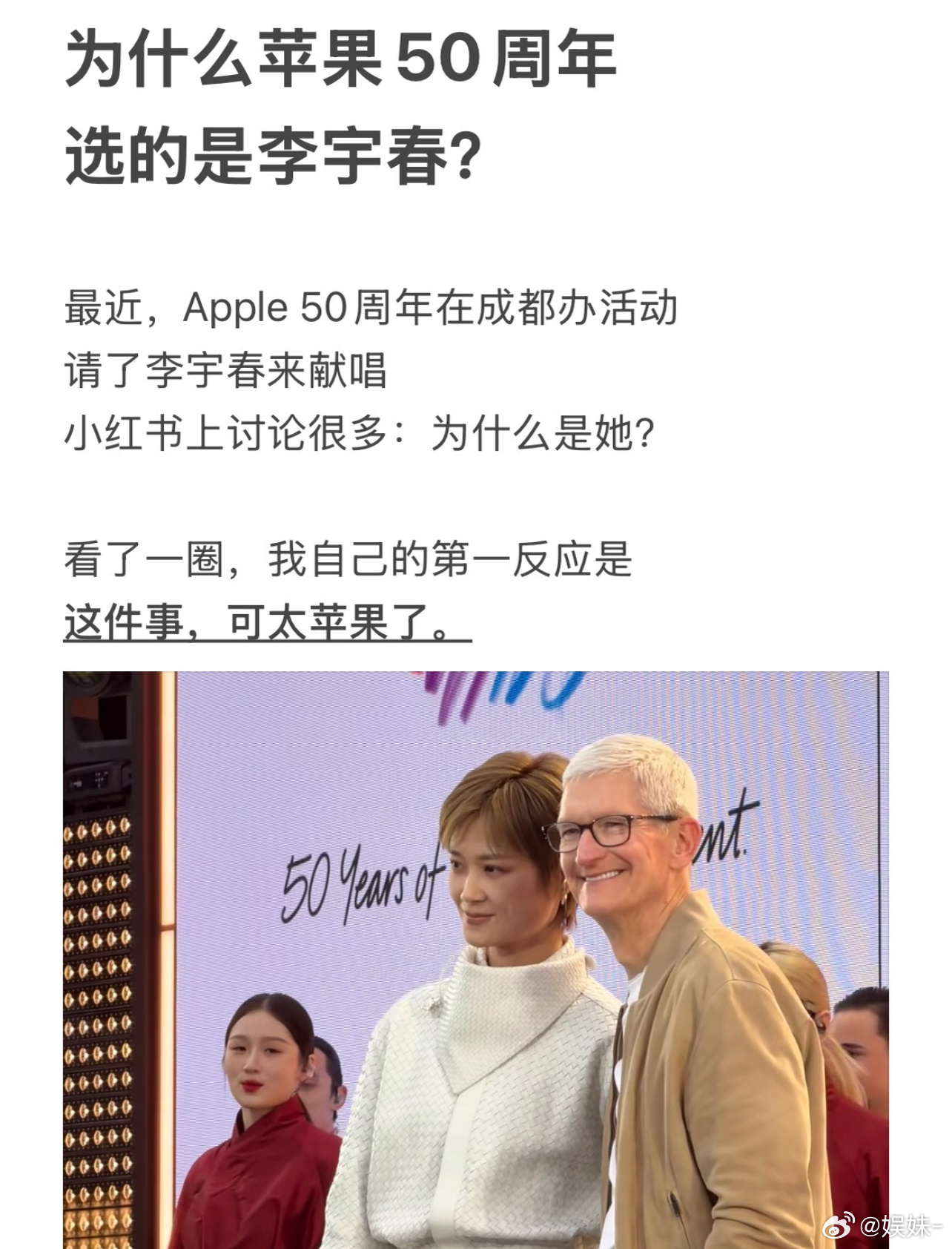 我感觉李宇春身上没有讨好感,苹果一直都没请过代言人,说明它要的不是流量型,要的是审美和气质符合品牌调性