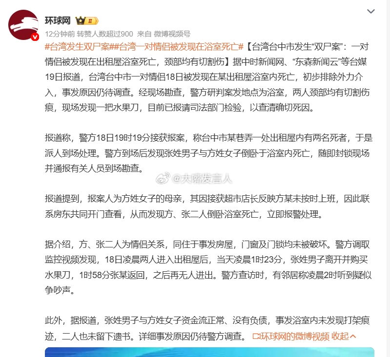台湾发生双尸案 看到这个双尸案,想起发生在湾湾的另一件“一尸两命”案,引起2019年东方之珠暴动的“一尸两命”案2018年2月航港男犯陈同佳在台北杀害同为航港人的怀孕女友潘晓颖(图1),并抛尸,然后逃回航港,湾湾方面侦破后并向航港追捕逃犯,航港想引渡陈到台北,于是修例,一群前英殖民余孽趁机兴风作浪搞动乱,然后台北就不想逃犯了,哪怕几年后陈在航港坐牢出来,经牧师感化,想去台北投案坐牢(图3),台北也拒绝,湾湾根本无视潘女家属的痛苦(图4)每每想到湾湾政客和司法机构的残忍、冷血,除了痛恨,还有对那些吹捧过湾湾司法的高大紧、贺某方之流(图7)的唾弃台湾一对情侣被发现在浴室死亡, 热点观点 ,中方回应台部分出入境文件改称南韩