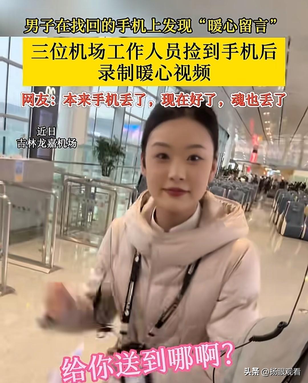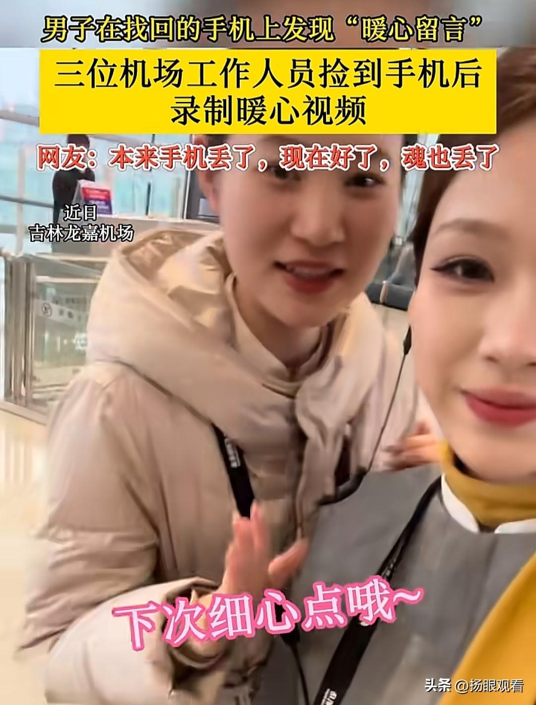 丢个手机把魂都丢了!近日在吉林龙嘉机场,一男子不小心把手机弄丢,本来又慌又急结果找回手机后直接被狠狠治愈了✨ 三位机场工作人员捡到手机后 不仅好好保管 还特意录了一段超级温柔的暖心留言 语气又甜又贴心 提醒他以后要保管好随身物品 本来丢手机超崩溃 看完直接被温柔到失语 网友纷纷调侃: 本来只是丢了手机 现在好了,魂也被这几位小姐姐勾走了! 小小的举动 却藏着满满的善意 真的被这波温柔狠狠戳中💛