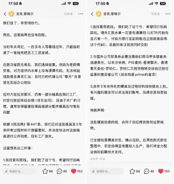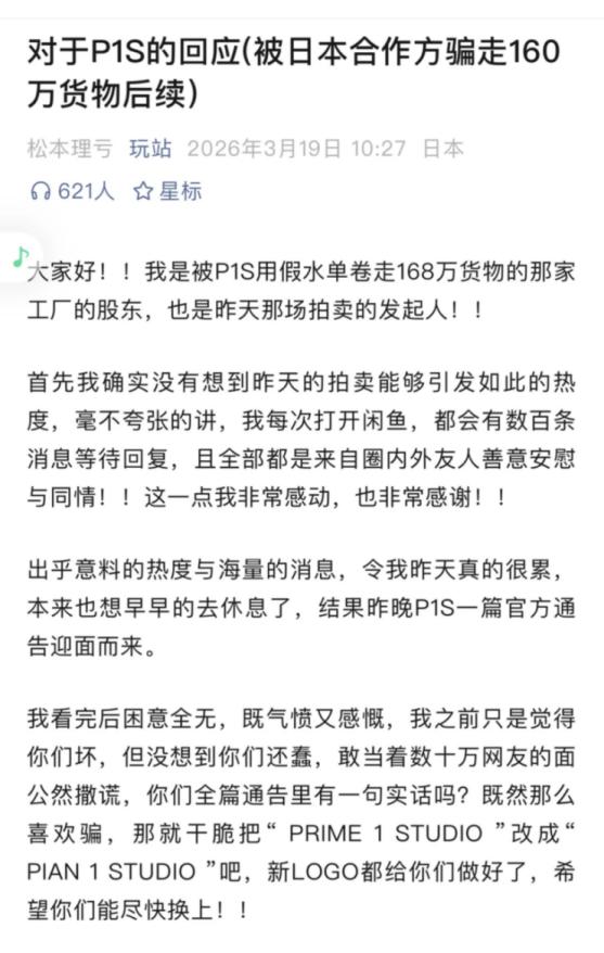 闲鱼解锁讨债功能,这波瓜真的越吃越上头。 惠州一家雕像厂,给日本知名品牌P1S代工五年,没想到合作收尾时被对方用假付款水单骗走价值160万的货物。工厂维权无果,只能把对方留下的模具挂到闲鱼拍卖,瞬间引来几万人围观竞拍。 更离谱的是P1S的操作:一边在日本说自己被“逼签不平等条约”,一边在国内又说和工厂没有法律关系,两份公告直接前后矛盾。 随后工厂直接放出录音、合同等实锤反击,还曝出P1S疑似用类似手段坑过其他代工厂,最讽刺的是,这位维权的股东,曾经还是P1S的忠实粉丝。 从线下求告无门,到线上公开硬刚,这波反转又解气,也让大家看到了中小企业维权的另一种打开方式。