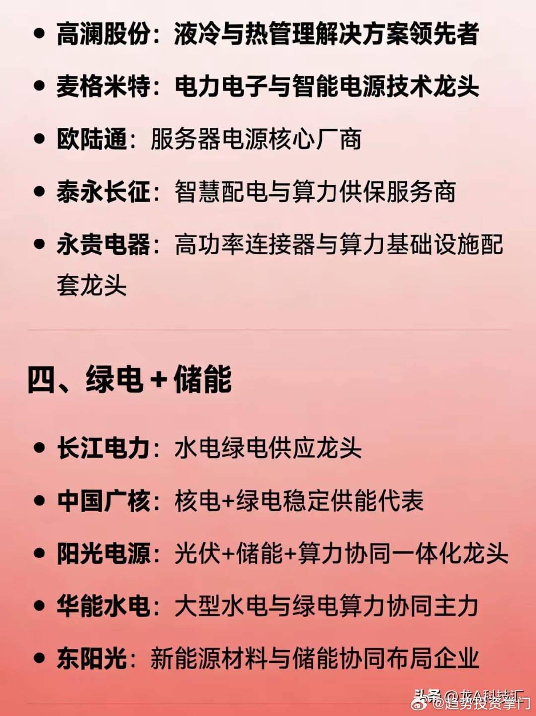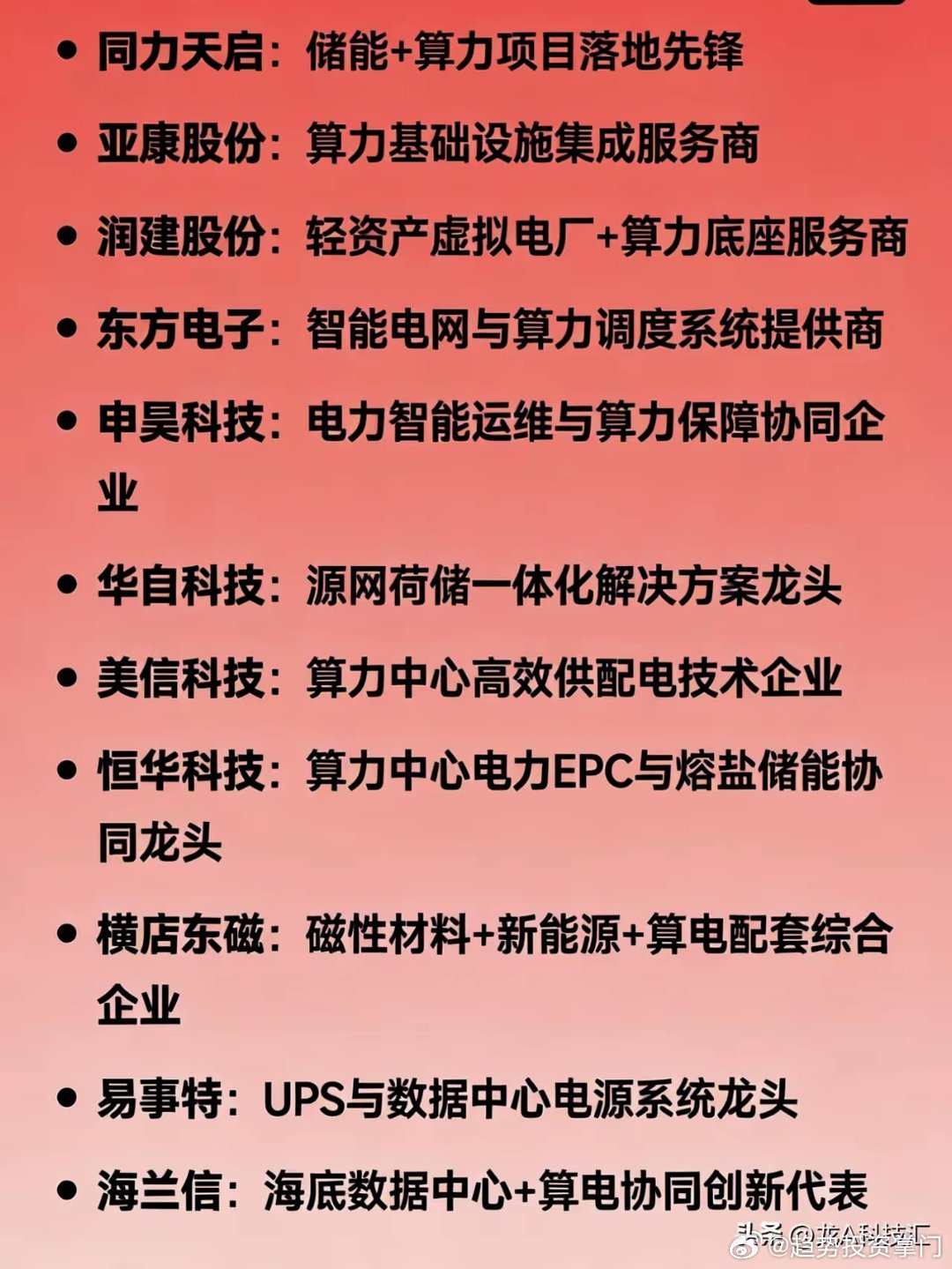 算力协同概念龙头分类汇总一、综合龙头(电+算双主业)- 协鑫能科:电力+算力双主营龙头- 豫能控股:火电+算力融合龙头- 金开新能:绿电+算力一体化标杆- 山高控股:综合能源+算力协同二、电网算力调度- 国电南瑞:电网AI调度龙头- 南网数字:算电数字化平台龙头- 四方股份:电力调度AI、虚拟电厂核心- 思源电气:智能电网+算力负荷协同三、电力设备/供电保障- 科华数据:智算中心电源、光储龙头- 中恒电气:HVDC高压直流市占率第一- 特变电工:特高压、算力供电龙头- 金盘科技:高效节能配电核心- 英维克、高澜股份:液冷温控龙头- 麦格米特、欧陆通:电源核心厂商- 泰永长征、永贵电器:配电、连接器配套四、绿电+储能- 长江电力、华能水电、中国广核:绿电供能龙头- 阳光电源:光伏+储能+算力协同- 东阳光:新能源材料+储能五、煤电+算力- 电投能源、晋控电力、新集能源:煤电转型算力- 万里扬:传统能源延伸算电协同六、其他关键环节- 中国能建:源网荷储算一体化总包- 润建股份:虚拟电厂+算力底座- 亚康股份:算力基建集成- 海兰信:海底数据中心+算电协同- 城地香江:IDC+电力一体化- 恒华科技、东方电子、华自科技、申昊科技等:电力EPC、调度、运维配套以上内容仅供参考,不构成投资建议。