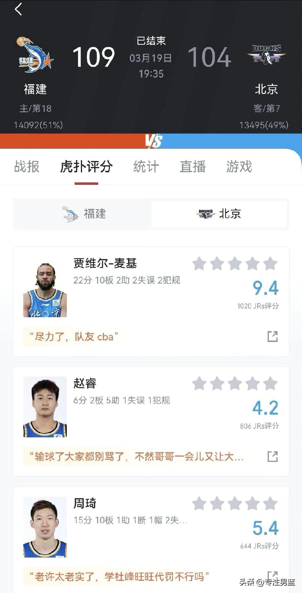 赵睿抓邹阳的衣服违体犯规了,裁判只判了普通犯规,逃过一劫。 邹阳2罚中1,福建男篮领先3分,北京队还有最后一攻的机会可惜没把握住。 周琦关键时刻2罚全失,是基本操作,这种情况见得太多了。 周琦上场23分钟,得到15+10, 赵睿上场15分钟,6+2+5。 邹阳上场36分钟,得到25+10。 福建男篮vs北京男篮