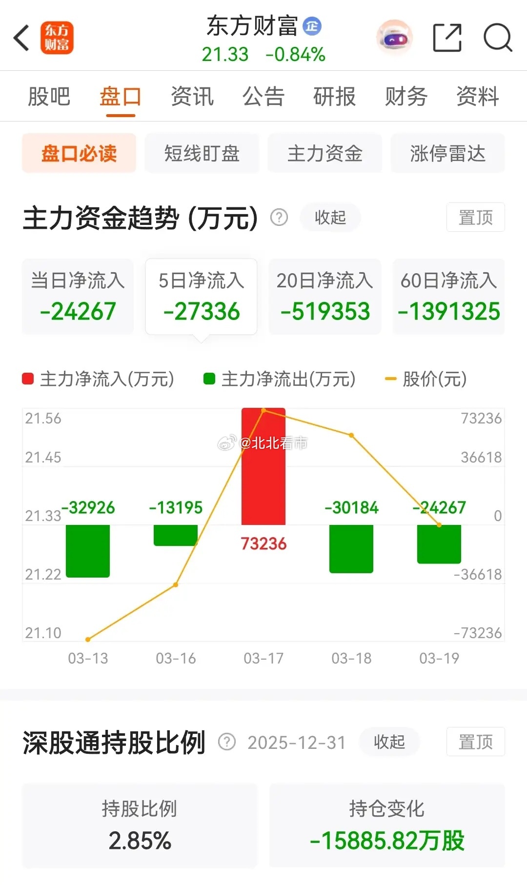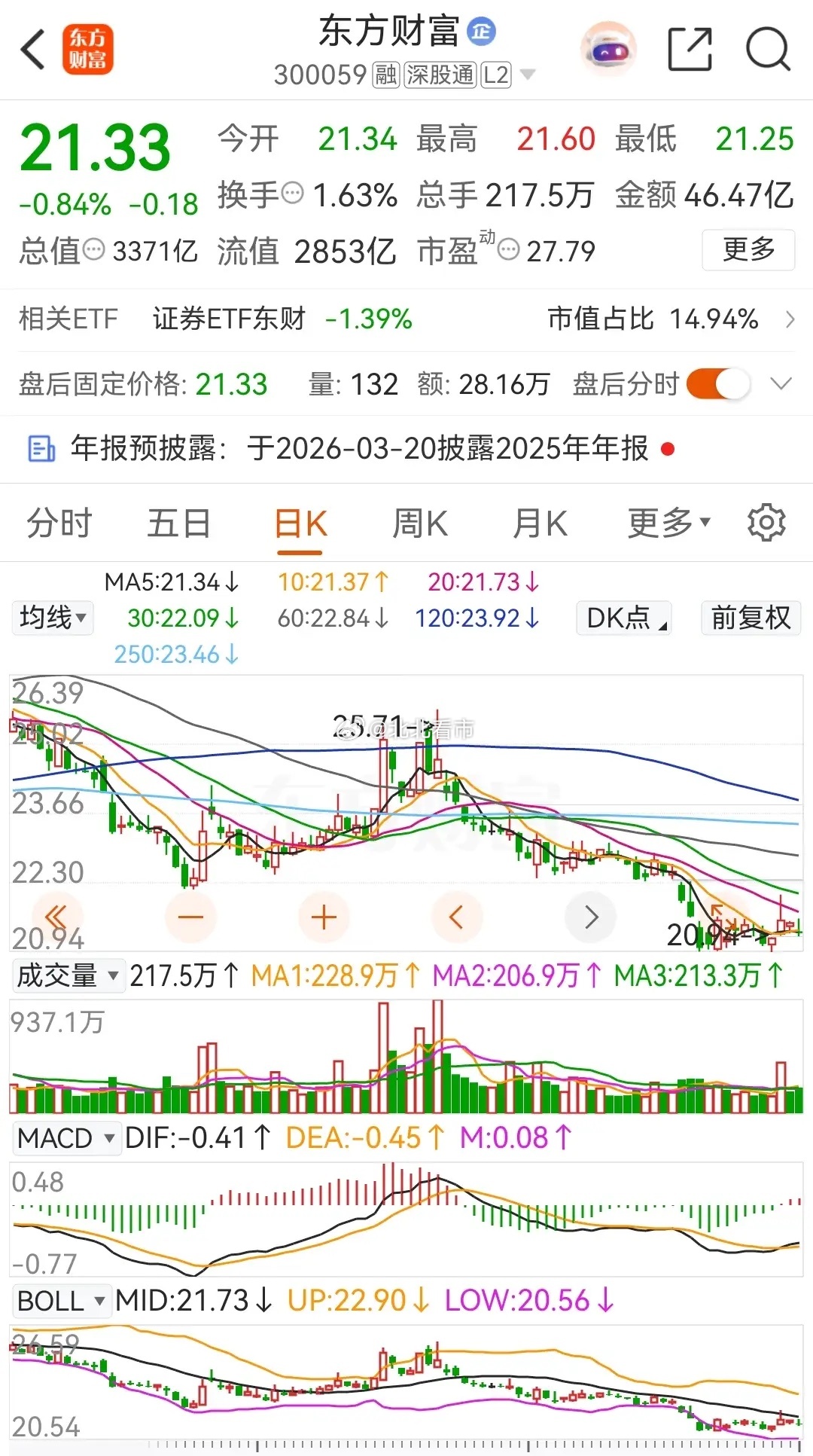 东方财富和中信证券今天又跌了,且连续两天被主力资金净卖出。券茅东方财富今天早盘低开后在低位整理,下午盘中小幅异动拉升后回落,收盘时下跌了0.84%,收盘报价为21.33元。在资金流向上,今天被主力资金净卖出了2.4267亿元,近五个交易日则是被主力资金合计净卖出2.7336亿元。从走势上看,今天在低位收出了一颗十字星线,整体上依然是在低位横盘整理。