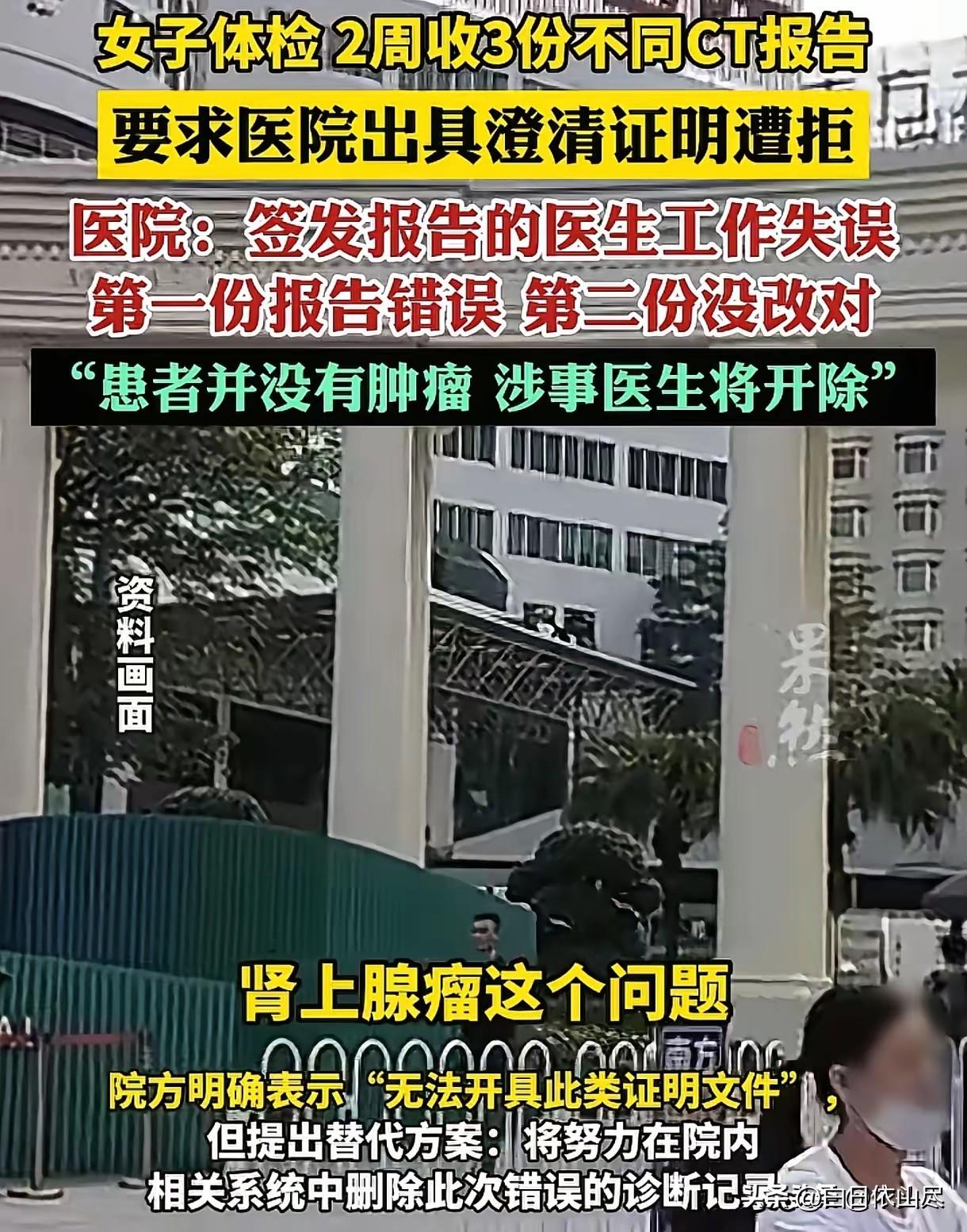 离谱!广东广州,女子去体检,查出肾上腺瘤,住院前一天,来了大姨妈,推迟住院。可她却发现CT报告上,影像描述写的是“右肾有结节”,下面诊断意见上写着“左肾小结节影”,一左一右,互相矛盾。女子反映后,医生修改报告,改成左肾肾上腺有结节。女子不放心,经院内会诊,发现女子并无肿瘤,报告是错误的。女子气坏了,要求医院给个说法! 广东广州一名女子的体检维权事件持续发酵,一份CT报告两周内三易其稿,从确诊肾上腺瘤到左右部位矛盾,再到最终确认无病,全程漏洞百出,女子险些接受一场完全不必要的手术。 事件曝光后,网友一边倒声援患者,直指医院流程形同虚设,拒绝开具澄清证明更是缺乏诚意。 2025年12月,女子在广州一家医院完成年度常规体检,原本只是想全面了解身体状况,拿到CT报告时却被当头一击。 报告明确提示肾上腺区域存在结节,初步诊断为肾上腺瘤,接诊医生结合影像数据,建议尽快办理住院,完善术前检查并准备手术治疗。 突如其来的肿瘤诊断让女子陷入极度恐慌,她立刻放下手头工作,安顿好家庭事务,全身心投入住院准备,连续多日被手术风险与预后问题困扰,精神压力达到顶点。 就在住院手续即将办理的前一天,生理期突然到来,按照临床操作规范,相关手术与侵入性检查必须暂缓,住院计划只能向后推迟。 这次意外推迟,意外成为整个乌龙事件的转折点。等待期间,女子再次仔细翻阅检查报告,逐字核对信息时,发现了令人震惊的矛盾之处: 影像描述栏明确标注右肾肾上腺结节,大小约1.4cm,下方诊断意见栏却写着左肾肾上腺小结节影,考虑腺瘤。同一次检查、同一份报告,结节位置左右颠倒、大小标注不一,基础信息出现致命错误。 女子带着疑问返回医院反馈,本以为医院会启动三级复核流程,重新判读原始影像,可接诊医生并未进行严谨复核,仅在系统内直接修改报告内容,将结节位置统一更正为左侧,大小也随意调整为0.5cm,出具了第二份矛盾重重的报告。 这种敷衍修改的做法,非但没有消除疑虑,反而让女子对整个诊断体系失去信任,她坚持要求启动院内多学科会诊,邀请放射科、泌尿外科专家共同重读影像。 经过多位专家联合研判,最终结论彻底推翻此前所有诊断,女子肾上腺及肾脏区域无任何结节、肿瘤及异常病变,此前的肿瘤判断完全是误诊。 得知结果的女子又惊又怒,惊的是自己虚惊一场,怒的是医院的草率操作险些让她白挨一刀。 如果不是生理期推迟住院,如果不是自己细心发现矛盾,如果没有坚持会诊,她已经躺在手术台上承受无意义的创伤。 惊魂落定后,女子提出核心诉求:由医院出具加盖公章的正式澄清证明,明确此前报告存在严重错误,本人身体健康无相关病症。 她表示,这份证明直接关系到后续购买商业保险、入职体检、医疗档案归档等关键事项,一旦错误记录留存,极有可能导致保险拒保、加费等长期隐患。 然而医院以无对应文件格式、仅可删除院内记录为由,直接拒绝开具书面澄清文件,仅口头承认医生操作失误,并称已对涉事医生作出开除处理。 事件在网络曝光后,迅速引发海量网友热议,评论几乎一边倒支持女子维权。有网友直言,报告左右不分、私自修改数据,是把患者生命当儿戏,医院三级审核制度完全形同虚设。 不少网友共情患者处境,指出错误诊断记录会影响终身保险办理,光开除医生、删除系统记录根本不够,书面澄清是最基本的合理诉求。 还有网友表示,医生失误是个人问题,医院拒开证明是态度问题,从头到尾缺乏对患者的尊重与歉意,更暴露了医疗质量管理的深层漏洞。 也有网友现身说法,称自己也曾遇到体检报告出错的情况,维权过程同样艰难,这类低级错误必须严肃整改,才能守住医疗安全底线。 从一份错误报告开始,到恐慌住院、意外推迟、发现矛盾、会诊平反、维权被拒,女子在十几天内经历了完整的医疗过山车。 恐慌、焦虑、愤怒、庆幸交织在一起,让她身心俱疲。而医院在事件中暴露的报告随意修改、复核缺失、敷衍维权等问题,也让公众对医疗安全的信任度受到冲击。 一份本该严谨至极的医学报告,接连出现低级错误;一场本该避免的误诊,险些造成不可逆的身体伤害;一个合情合理的澄清诉求,却成为难以跨越的维权壁垒。 对此,你们有什么看法,欢迎评论留言~