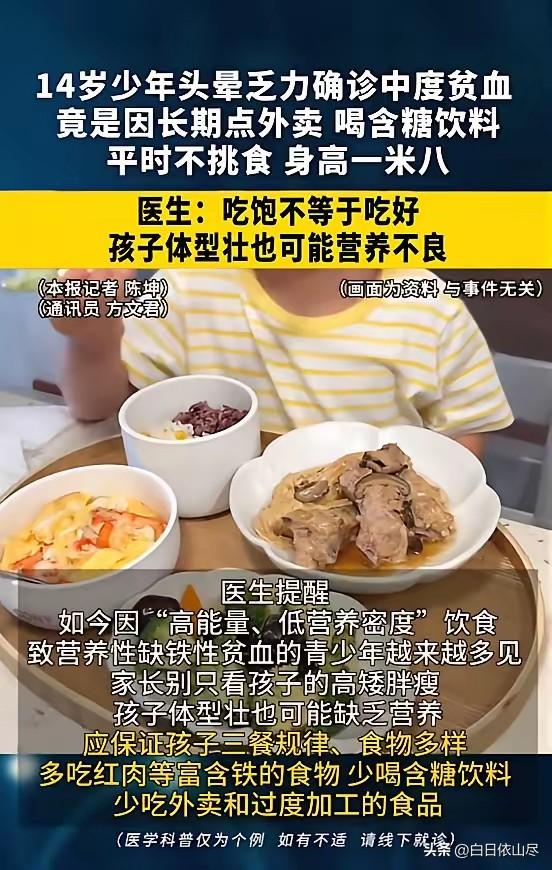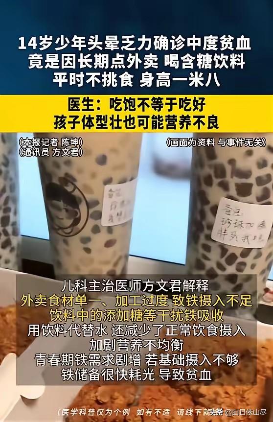 “悲剧还是发生了!”福建,一14岁男孩身高1米8 ,体型壮实,从不挑食,可最近一个月持续头晕乏力,脸色苍白,后面还出现头痛,去医院检查,竟被查出中度缺铁性贫血,原来,这都是男孩长期点外卖并且把饮料当水喝造成的!网友:万万没想到! 福建一名14岁男孩的身体状况,让身边所有人都感到意外。这名男孩身高已经达到1米8,身形高大壮实,平时胃口极好,从不挑食, 在家人眼里完全是健康结实的模样,谁也不会把他和贫血这类问题联系在一起。可就在近一个月时间里,男孩身上接连出现了反常的身体信号,让整个家庭陷入了担忧。 最初男孩只是频繁感到头晕乏力,做什么事情都提不起精神,原本活泼好动的状态慢慢消失,就连日常上下学、简单的活动都觉得疲惫不堪。 家人一开始只以为是学业压力大、休息不足导致,并没有立刻意识到问题的严重性,只是让男孩多补充睡眠、减少劳累。 可情况并没有好转,反而一步步加重。男孩的面色逐渐变得苍白,没有了同龄人该有的红润气色,头晕的频率越来越高,严重时甚至会站不稳。 没过多久,头痛的症状也开始出现,发作时影响到正常的学习和生活,身体状态明显下滑。 察觉到异常后,家人立刻带着男孩前往医院进行全面检查。经过血常规等多项专业检测,最终的诊断结果让全家人难以接受——男孩被确诊为中度缺铁性贫血。 这样的结果完全超出预期,身高突出、体格壮硕、胃口正常的孩子,怎么会和中度贫血扯上关系,医生也针对生活习惯展开了详细询问。 在一步步梳理日常作息和饮食后,真正的诱因逐渐浮出水面。男孩长期保持着极不规律的饮食模式,平日里父母工作繁忙,无法按时准备三餐,男孩便长期依靠点外卖解决吃饭问题,很少摄入家庭烹制的新鲜食材。 外卖食物大多重油重盐,营养结构单一,铁元素等关键营养物质的摄入严重不足,长期下来为身体埋下隐患。 除此之外,男孩还有一个坚持已久的习惯,就是完全用各类饮料代替白开水,口渴时从不喝白水,全部依靠甜味饮料补充水分。 这类饮品不仅无法为身体提供必需的矿物质,还会干扰身体对铁元素的吸收,进一步加剧体内铁含量的缺失。 两种不健康的习惯长期叠加,最终让外表看起来强壮的男孩,身体内部出现了严重的营养失衡。 医生结合检测数据与生活习惯,明确指出持续外卖+饮料代水的模式,是直接诱发中度缺铁性贫血的主要原因。 确诊后,男孩开始按照医嘱接受针对性调理,调整饮食结构,停止饮用饮料,逐步补充铁元素,家人也重新规划了三餐安排,全力帮助孩子恢复健康状态。 这一事件也让不少家长警醒,外表壮硕并不等于身体健康,隐藏在饮食背后的健康漏洞,往往更容易被忽视。 对此,你们有什么看法,欢迎评论留言~