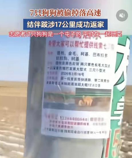 比人还团结!据说这七只狗狗是被人偷走的,并且已经上了高速,如果不是中途有狗咬破了牢笼,估计这些狗狗就会被运到千里之外,其命运不得而知。   这件事发生在吉林长春的一处村庄,涉事的七只狗狗都是村里邻里家养的宠物,平日里经常凑在一起玩耍、结伴溜达,彼此之间早就形成了极强的默契,不管是出门还是休息,几乎都是形影不离的状态。   这些狗狗品种不一,有体型健壮的大狗,也有身形小巧的幼犬,平日里在村里安分守己,陪着主人看家护院,从未惹过麻烦,可这份平静的生活,却被偷狗贼的出现彻底打破。   偷狗贼趁着村民疏于防范、狗狗独自在外活动的间隙,悄悄盯上了这七只结伴的狗狗,用不法手段将它们全部掳走,随后强行塞进提前准备好的密闭铁笼,装上货车准备转运。   整个偷盗过程十分迅速,等狗狗主人发现爱犬失踪时,偷狗贼早已驾车驶离村庄,带着狗狗踏上了高速路段。   此时的狗狗们被关在狭小拥挤的铁笼里,四周漆黑一片,车辆持续颠簸,它们能清晰感受到自己离熟悉的家园越来越远,等待它们的大概率是被运往千里之外的陌生地方,后续是被贩卖还是遭遇其他不测,根本无从知晓。   被困在牢笼里的七只狗狗没有坐以待毙,绝境之下爆发出了极强的求生欲,其中一只狗狗率先用牙齿拼命啃咬铁笼的缝隙和锁扣部位,其余狗狗见状也纷纷上前配合,有的啃咬、有的用身体冲撞牢笼,齐心协力撕扯束缚它们的铁网。   经过一番奋力挣扎,原本坚固的牢笼被硬生生咬破缺口,狗狗们抓住车辆行驶途中的空隙,挨个从破损的牢笼里挣脱出来,从疾驰的货车上跳落到高速路面上。   高速上车流密集、车速极快,周边环境陌生又危险,换做普通动物大概率会惊慌失措、四散奔逃,可这七只狗狗却展现出了超乎想象的团结。   落地之后,没有一只狗狗独自逃窜,它们第一时间聚集在一起,快速确认彼此的状态,随后排成整齐的队伍,沿着高速应急车道朝着家的方向前行。   途中有一只狗狗在跳车时腿部受伤,行动变得迟缓艰难,其余狗狗立刻放慢脚步,自发将受伤的同伴护在队伍中间,体型偏大的狗狗走在外侧抵挡车流风险,全程不离不弃,始终保持着队伍队形,一步一步艰难跋涉。   这段归家之路长达17公里,狗狗们没吃没喝,还要时刻提防过往车辆,累了就找安全的角落短暂停歇,即便身心俱疲,也没有一只狗狗掉队,更没有抛弃受伤的同伴。   有夜间行车的车主偶然发现了这支特殊的队伍,拍下视频发布到网络上,视频很快引发全网关注,爱心网友、动物救助志愿者和当地村民纷纷行动起来,顺着高速沿线展开搜寻,根据网友提供的线索逐步缩小寻找范围,最终成功找到了这七只历经艰险的狗狗。   事情的最终结果十分圆满,七只狗狗全部被平安找到,除了一只狗狗有轻微外伤之外,其余狗狗身体均无大碍,随后陆续被送回各自的主人身边。   失而复得的狗狗们回到熟悉的村庄后,很快恢复了往日的状态,依旧像从前一样结伴玩耍,这场惊心动魄的逃生之旅,让它们彼此的羁绊变得更加深厚。而涉事的偷狗贼,相关部门也已经介入调查,后续会依法追究其责任。   这件事在网络上持续发酵,无数网友看完都感慨万千,大家纷纷留言表达自己的看法。   有网友说“这才是真正的团结,不抛弃不放弃,比很多人都做得好”。   也有网友表示“看着它们结伴跋涉的样子太心疼了,偷狗贼真的太可恨,必须严惩”。   还有网友留言“狗狗都知道守护同伴,人更应该珍惜身边的情谊,同时也要看好自家宠物”。   这件事也给所有人敲响了警钟,偷狗行为不仅严重侵害他人财产权益,更是漠视生命的违法行为,会给养宠家庭带来极大的伤痛。   同时也提醒广大养宠人士,日常一定要看管好自家宠物,尽量避免宠物独自长时间在外逗留,不给不法分子可乘之机;遇到疑似偷狗、虐狗的行为,要及时留存证据并向相关部门举报,共同抵制这类恶行。   这群狗狗用纯粹的团结和顽强的求生欲,创造了平安归家的奇迹,也让大家看到了动物之间最真挚的羁绊。   你看完这件事有什么感受?你身边有没有发生过类似的宠物自救事件?欢迎在评论区留言分享。