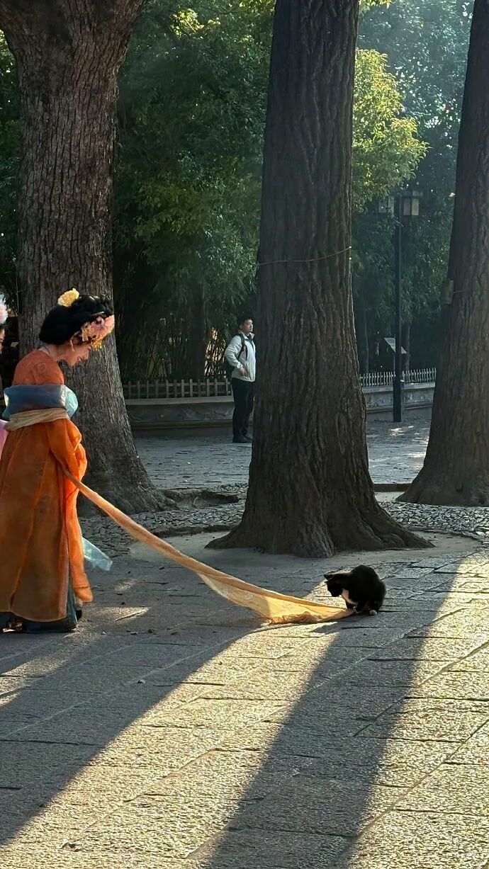 网友去西园西偶遇一只调皮的小猫 追着小姐姐的披帛玩,这和《簪花仕女图》岂不是一模