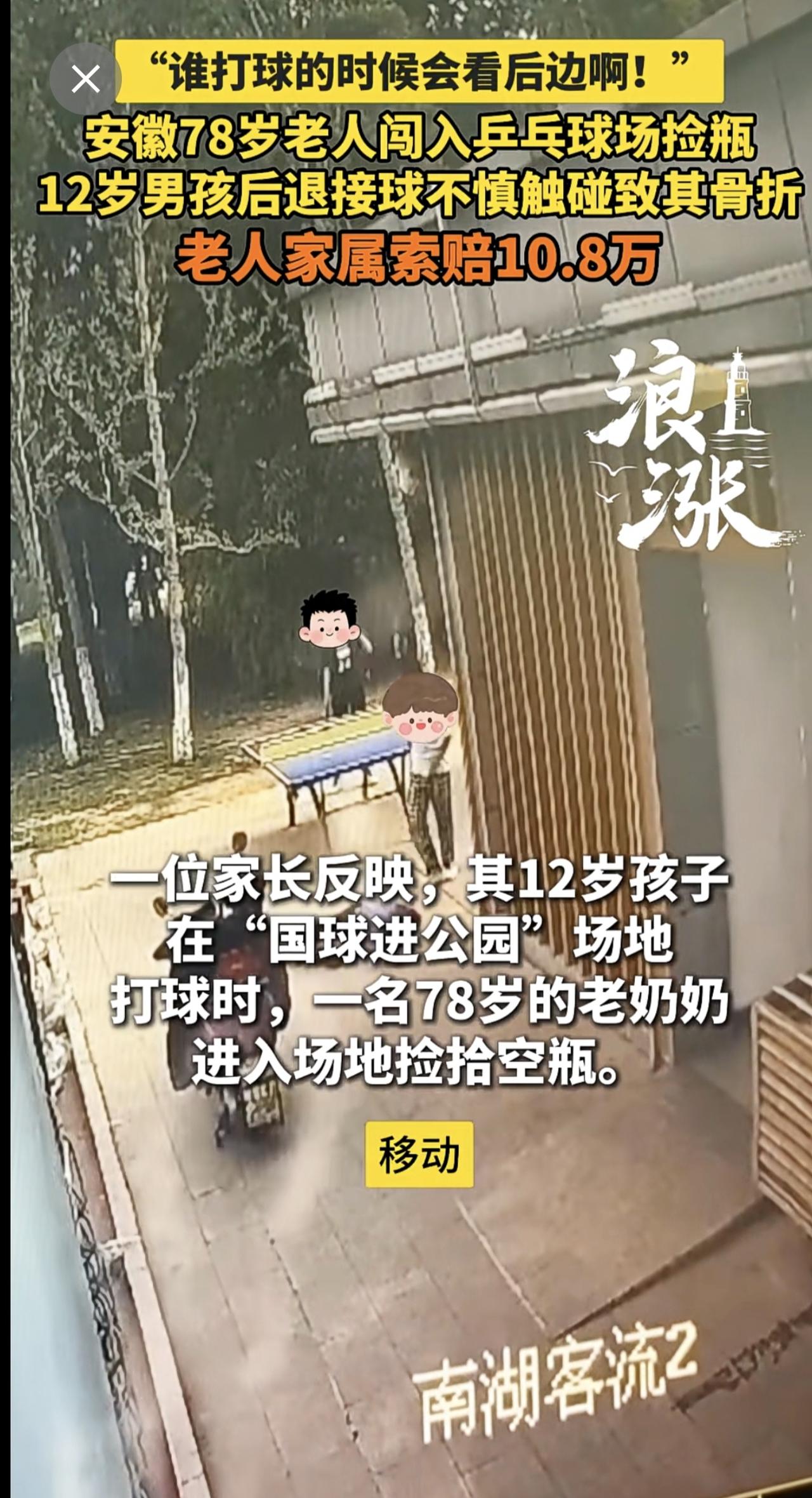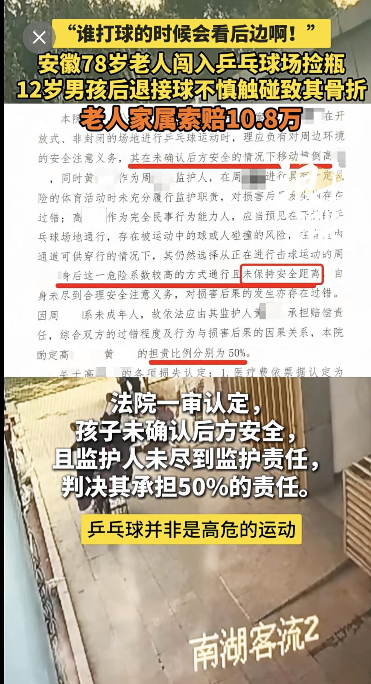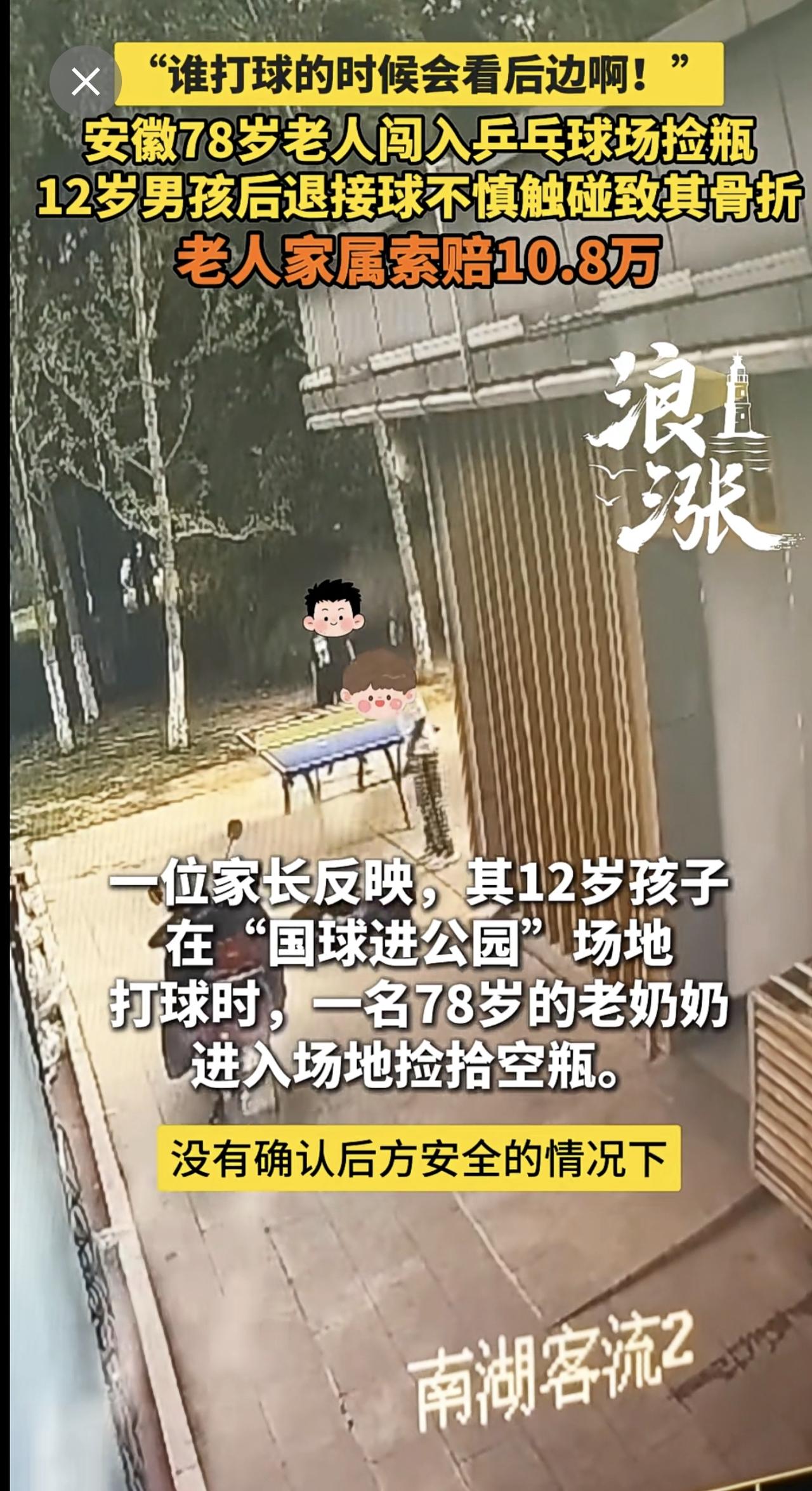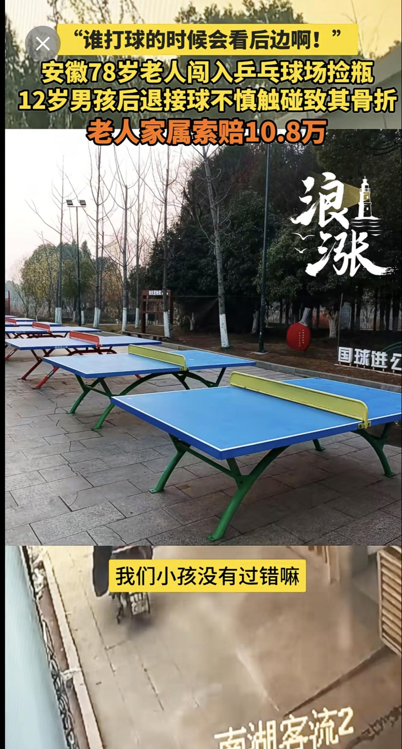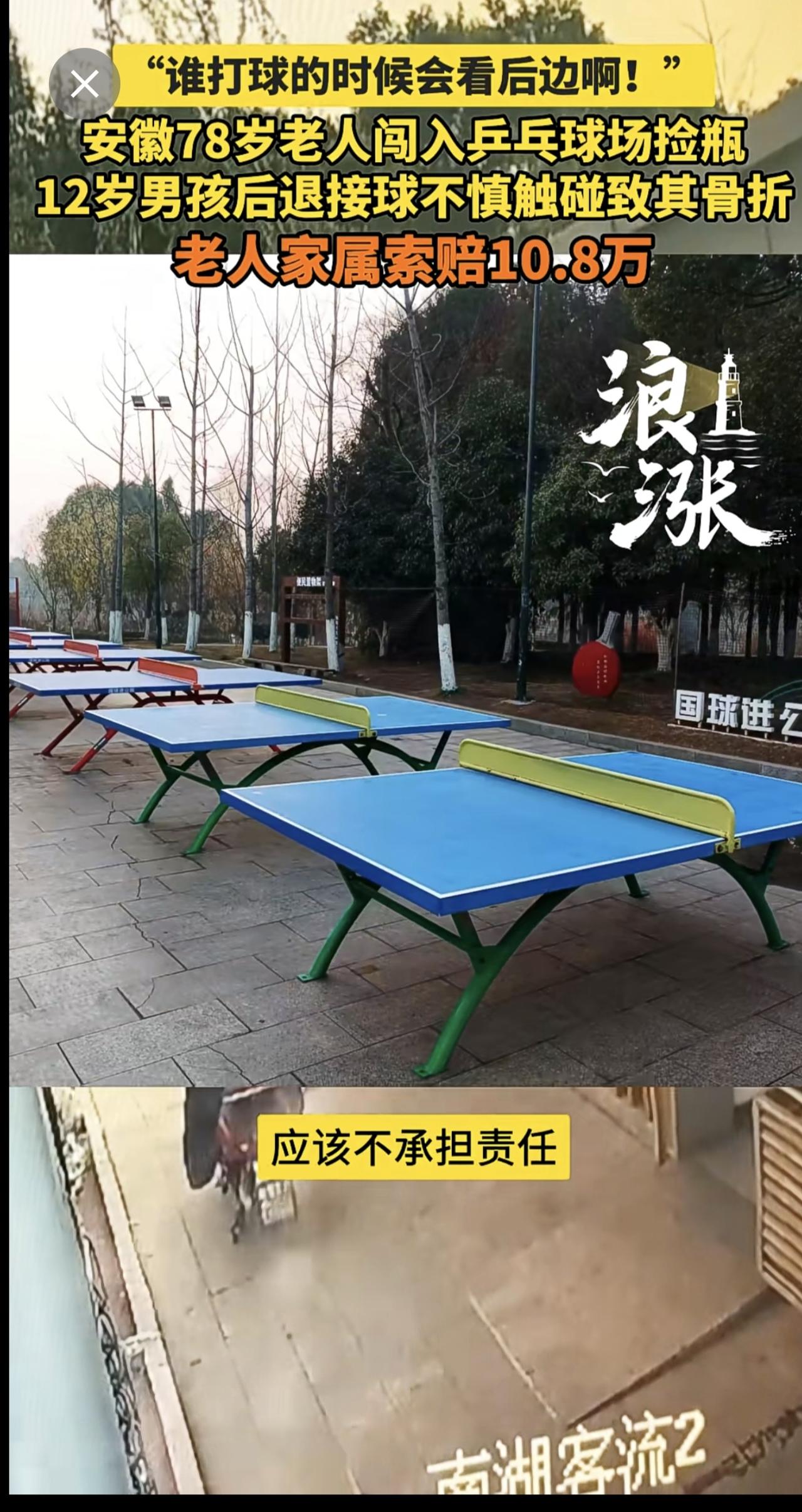 “谁打球的时候会看后边啊!” 安徽78岁老人闯入乒乓球场捡瓶 12岁男孩后退接球不慎触碰致其骨折 老人家属索赔10.8万(青岛新闻网/浪涨新闻 记者 宇鑫)安徽 78岁老人闯入乒乓球场捡瓶
