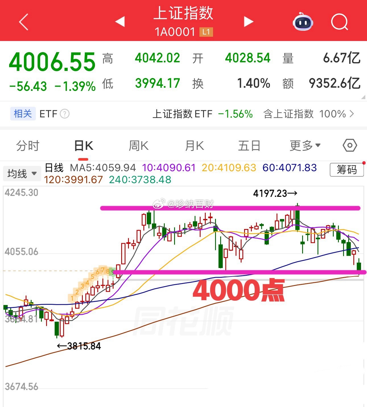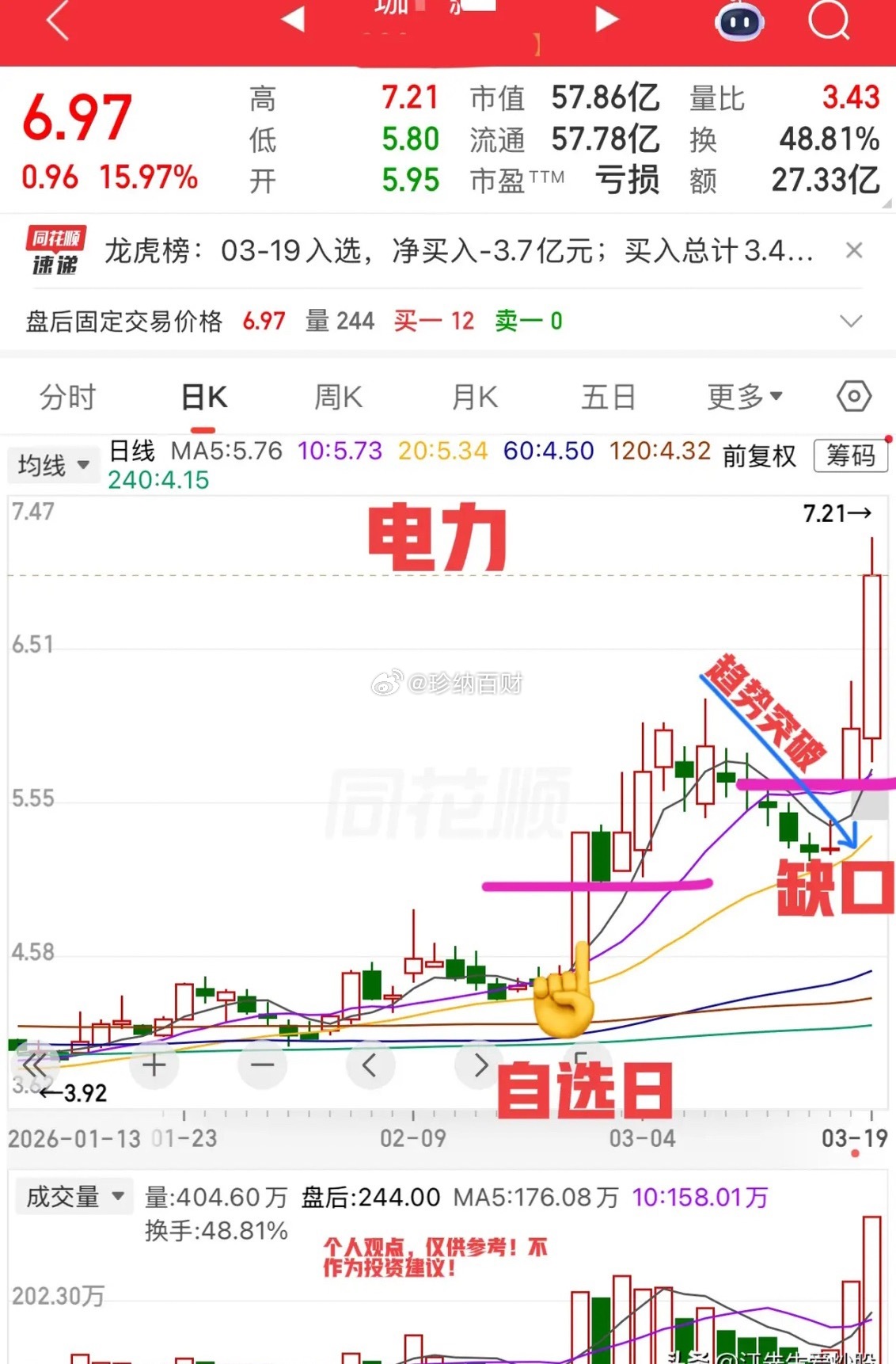 2026.3.19周四收评: 险守4000点,5000家个股下跌,太惨了! 今天这个市场走的实在是太难看了,基本上没啥可说的,两个字总结,叫“通杀”,更关键的量还是没能够放出来,没有量就不能言底,所以,短期最重要的一个参考指标,就是量,没量即使有反弹反抽高度也有限。 个股今天杀伤力非常大,5000只个股下跌,平均股价跌了2.44%,这个操作难度可想而知。 技术面,4000点是重要的心理关口,也是重要的颈线支撑,我个人认为一次性跌破的概率不大,大概率守得住,但也不会马上就反转,这个也不太现实,还得磨。目前还没有止跌迹象,4000点大概还要被反复考验,但能否拉回来就比较关键了。 今天情绪杀的比较狠,有冰点就会有修复,所以明天大概率还得看反弹修复疗伤。 今天红的大部分都是参考的案例吧!最典型的是《绿色电力》这个案例!图3所示,昨天有没有给大家讲过可以杀个回马枪,做10日线的预期,今天刚好回调到10日线附近拉起来。这种头肩底形态+《缺口战法》确定性就比较高,但记住每一次创新高,不封板,都是找T点。10日线的支撑预期还有3天,后面就要看20日线和缺口了。 图3图4大家有没有发现,一模一样的形态走势,同属于《缺口战法》,今天都是10日线的支撑预期,都冲击10cm没封住,图5也是最近的案例!今天更是大涨15.97%,形态不同,但逻辑一样。 今天刚好给大家普及一下,江先生独创的《缺口战法》,以后自己可以有意识的留意一下。 有时候缺口挺好用的,只是大部分人容易忽视,尤其是带量的突破性质的缺口,尤其是大盘环境好的时候成功率更高。胡先煦秒删博