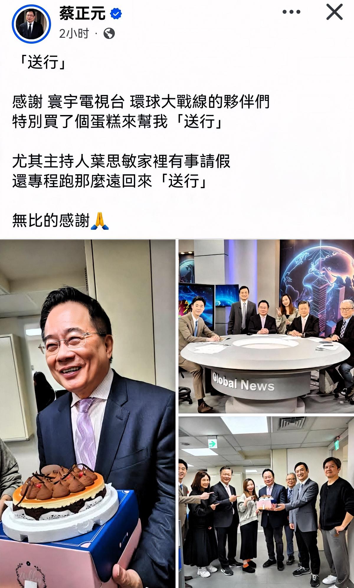 离了个大谱!蔡正元明天就要去服刑“蹲号子”了,今天居然还跑去录节目,这心态也是没谁了! 3月19号下午,寰宇电视台《环球大战线》节目组那叫一个“贴心”,还专门给他做了个蛋糕送行,这场景,真是既荒诞又让人哭笑不得。 原来,因为“三中案”,台高院二审维持原判,蔡正元因“业务侵占罪”得去牢里待上3年6个月。这消息一出来,国民党那边可热闹了,副主席萧旭岑站出来力挺他,说他一直在推动两岸和平,还对抗民进党,是个“大功臣”。 除了国民党,邱毅、柯文哲还有馆长陈之汉也来送别,馆长更是豪气,还请他吃了顿饭,这“最后一餐”吃得估计也是五味杂陈。 入狱前,蔡正元还寄语两岸,希望两岸能和平相处,还对国民党和民众党执政提了点想法。不过话说回来,犯了罪就得接受惩罚,这是天经地义的事儿。也希望他的这些话,能让岛内那些还在“迷糊”的民众好好想想两岸关系,别光顾看看热闹,也该为两岸的未来出份力了。毕竟,和平才是大家最想要的,不是吗?