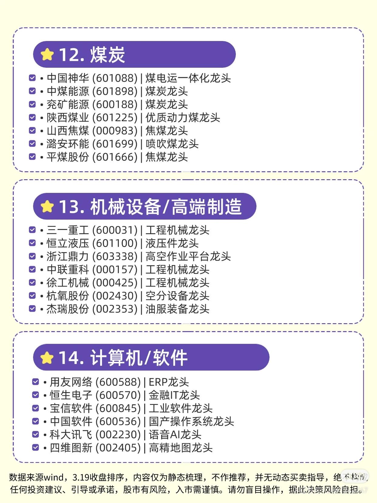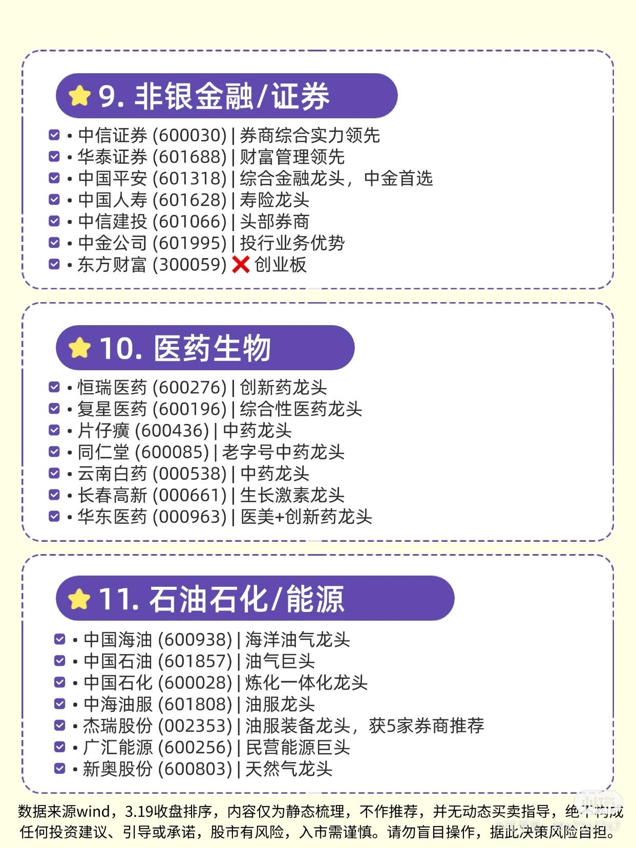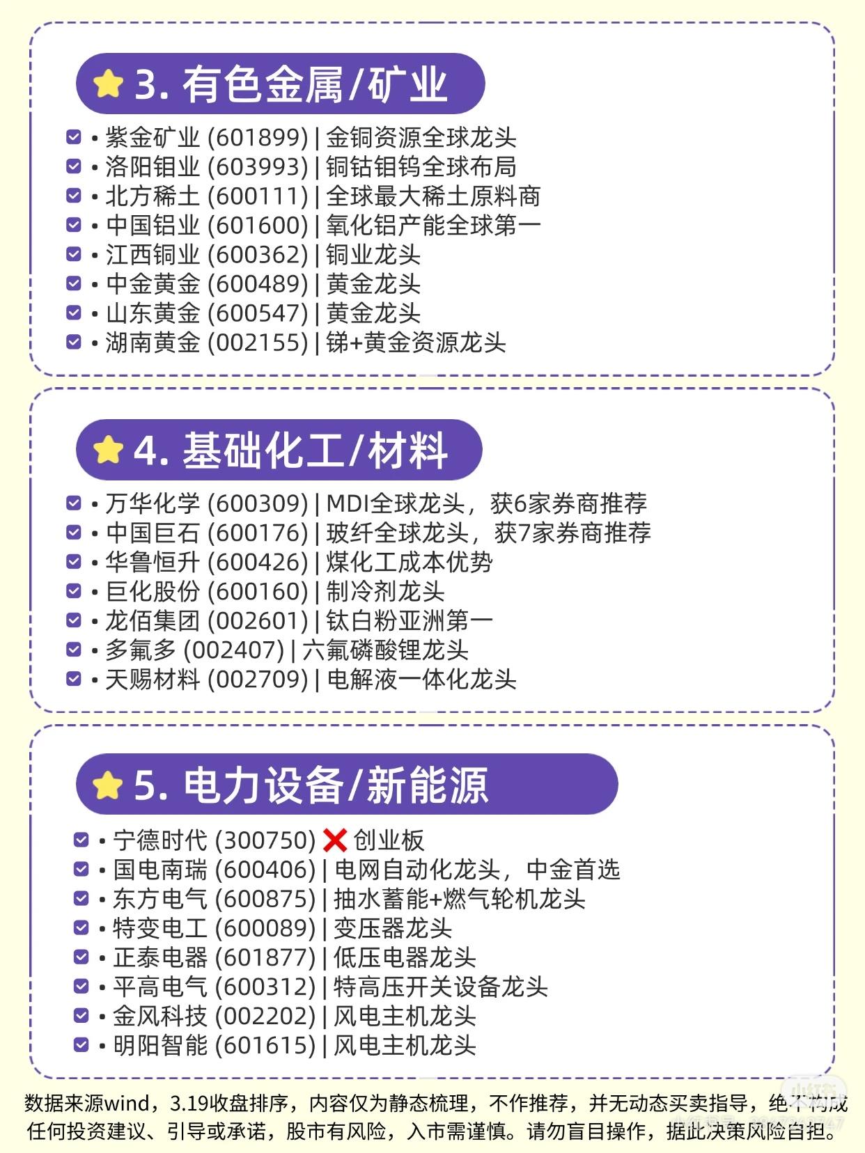 这份资料梳理了30个细分行业的龙头企业,涵盖AI算力/光通信、半导体/芯片、有色金属/矿业、基础化工/材料、电力设备/新能源、汽车/零部件、食品饮料/白酒、国防军工、非银金融/证券、医药生物、石油石化/能源、煤炭、机械设备/高端制造、计算机/软件、通信设备/物联网、银行、建筑/基建、农林牧渔、交通运输/物流、环保/公用事业等行业。 每个行业列出了代表性企业及定位(如“全球龙头”“产能第一”“细分领域龙头”等),部分企业标注“创业板”。资料基于3.19收盘数据静态梳理,不构成投资建议,提示股市风险、入市需谨慎。