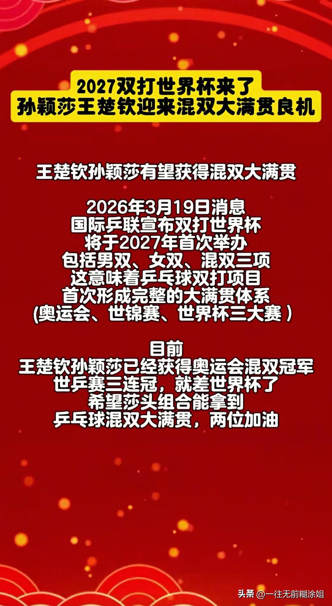 展望2027,好消息炸出:双打世界杯来了! 就在今天,国际乒联宣布了:双打世界杯将于2027年首次举办。 它包括混双,女双和男双三个项目。这下好了,双打大满贯有了完整的体系。 我们的莎头组合如果能拿到这次的混双冠军就提前取得大满贯。 祝莎头马到成功!加油俩小子!