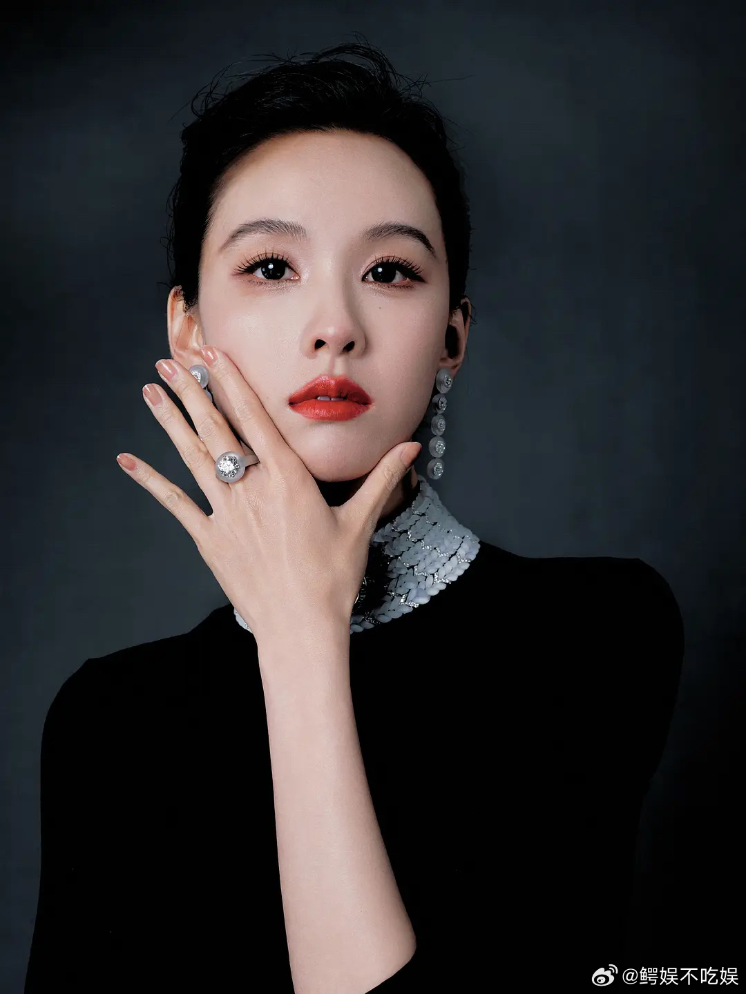 陈都灵今日出席Boucheron宝诗龙品牌活动造型大片,身着一袭黑色修身连衣裙搭