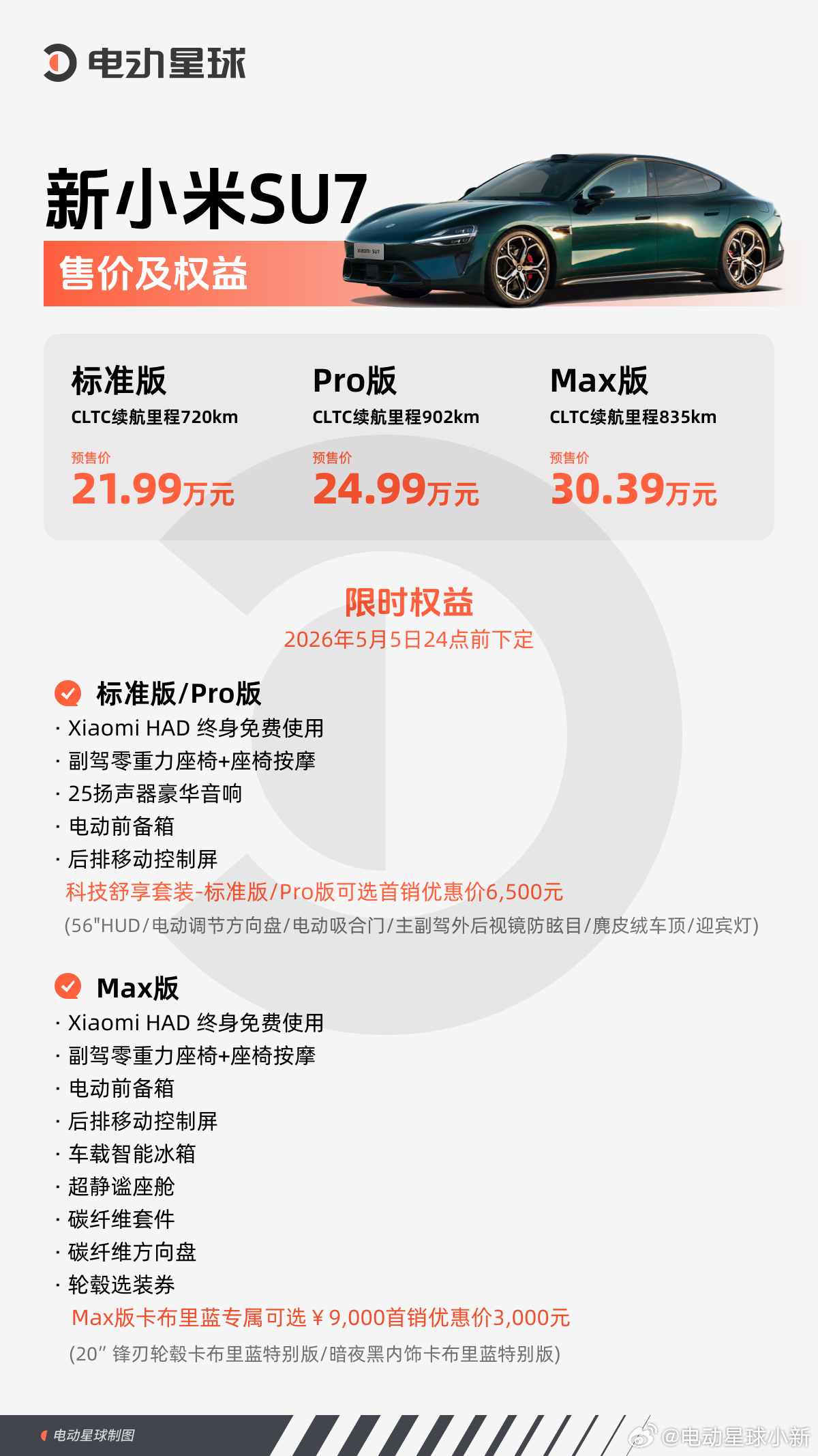 小米全新一代 SU7 终于上市了,起售价 21.99万。虽然全系比老款贵了 4000 块,但看完配置后,居然觉得有点香?这次标准版提升最大。除电池容量、电机(Max版双电机)、空悬及 CDC 减振器外,其余核心配置在三款车型上基本做到了全系对等。具体的参数差异不再赘述,首销权益总结来说就是:送!免费送!小米还专门为标准版和 Pro 版提供了“科技舒享包”选装,通过更灵活的配置组合,进一步缩小了与顶配之间的体感差距。面对这三款新 SU7,你会怎么选?