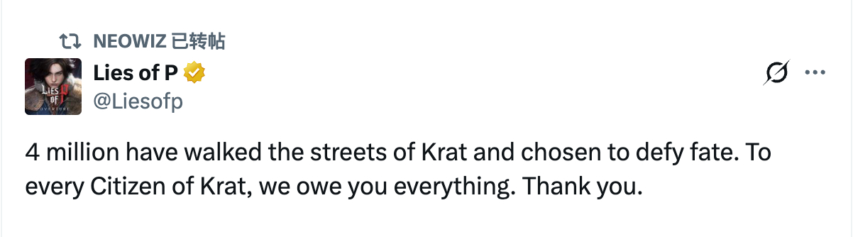 官方宣布《匹诺曹的谎言》全球销量已突破400万份,并公开了致谢贺图:“四百万人曾漫步在克拉特的街头,选择与命运进行抗争。对于克拉特的每一位公民,我们都感激不尽。谢谢大家。”