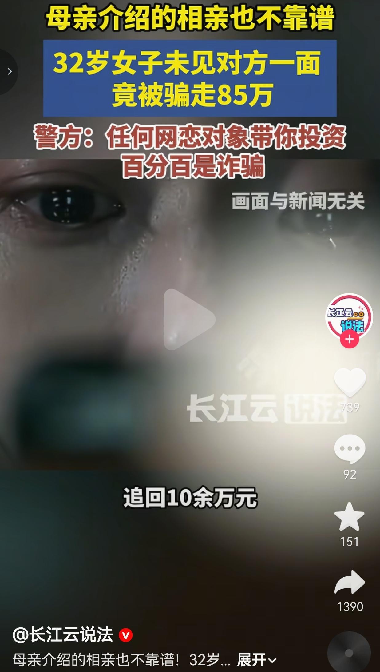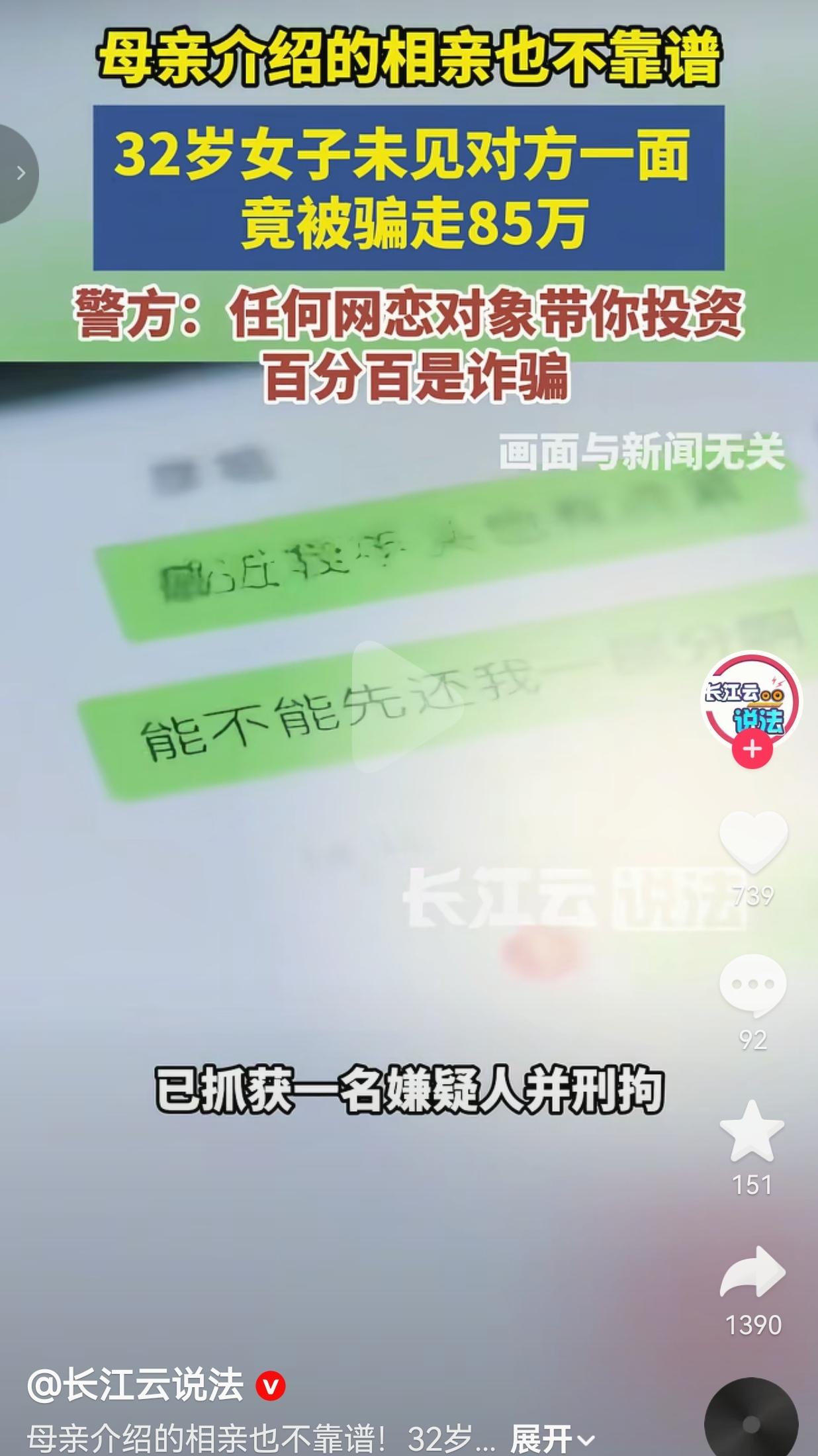 母亲介绍的相亲对象也敢骗!32岁女子连面都没见,85万血汗钱没了! 甘肃兰州32岁的康女士,就因为母亲介绍了个“相亲对象”,连对方真人长啥样都没见过,短短一个月被骗走85万!这哪是相亲,这分明是“杀猪盘”2.0升级版! 康女士本来就被催婚催得焦虑,一听是亲妈介绍的,彻底放下了戒心。加了微信后,对方嘘寒问暖,发照片、说情话,把康女士哄得晕头转向,觉得自己终于遇到了“真命天子”。 骗子一步步设套,先聊感情拉近距离,等康女士完全信任后,就开始“不经意”透露自己有“内部投资渠道”,能稳赚不赔,还晒出所谓的“收益截图”。 康女士一开始还犹豫,可骗子嘴甜得很,说“以后咱们要结婚买房,多攒点钱不好吗?”再加上母亲介绍这层滤镜,她彻底昏了头脑,从几万到几十万,一笔笔往骗子的账户里转钱,前后加起来整整85万! 等康女士反应过来想把钱要回来时,骗子直接失联,她才哭着报了警。 目前警方已经抓获一名嫌疑人并刑拘,可只追回了10多万,剩下的70多万大概率打了水漂。 网友们看完都炸了,评论区全是心疼和愤怒: “我真服了!亲妈介绍的都能是骗子?现在的杀猪盘都进化到啃老本了?康女士这85万得攒多少年啊,想想都心疼!” “催婚催出来的悲剧!要是家里不天天逼婚,姑娘能这么轻易上当吗?骗子就是抓准了大龄单身的焦虑!” “任何网恋对象带你投资,百分百是诈骗!这句话我都说倦了!怎么还有人往坑里跳啊!” “85万啊!够买套房首付了!就这么给了个连面都没见的人,我隔着屏幕都想拍醒她!” “亲妈也得背锅!介绍对象连对方底细都不核实,就敢往女儿微信里推,这不是帮骗子递刀吗?” 我真的越想越气!这些杀猪盘骗子,简直是吃人不吐骨头!专挑大龄单身、被催婚焦虑的姑娘下手,利用她们对亲情的信任、对爱情的渴望,把人家一辈子的血汗钱骗得干干净净! 更让人生气的是,有些长辈根本意识不到问题的严重性,为了“赶紧把女儿嫁出去”,随便从哪听来个“靠谱对象”就往孩子身边推,连对方是人是鬼都没搞清楚,最后坑的还是自己的孩子! 康女士的错,从来不是“想谈恋爱”,而是错信了“母亲介绍”这四个字,错在被催婚的焦虑冲昏了头脑。可那些骗子,还有那些不负责任的“介绍人”,才是真正的刽子手! 这件事给所有姑娘敲了个警钟:不管是谁介绍的对象,只要没见过真人、没核实过身份,就绝对不能掏一分钱! 催婚再急,也不能拿自己的血汗钱赌。想谈恋爱再迫切,也得守住钱袋子! 最后,我想说的是:“宁肯单身一辈子,也别给骗子送一分钱!” 信息来源:长江云说法