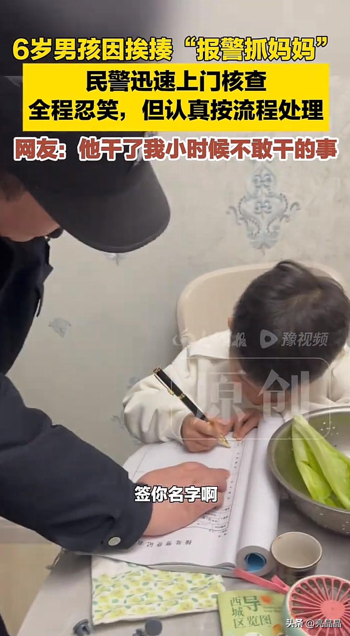 笑不活了!河南焦作,6岁小男孩不写作业被妈妈教育,一气之下拨打110:“把我妈妈抓走”,妈妈被气得不行,直言你真有本事啊! 3月19日当天,孩子想下楼骑车玩,妈妈因外面天气冷,拒绝了孩子,让他先写作业。 孩子不听,一直哭闹,妈妈忍不住上手教育了一顿。 没想到孩子趁家人不注意,偷偷拿了手机,反锁房门,拨打了110。 妈妈在房门外,听到儿子报警说:“把我妈妈抓走”,是又好气又好笑,骄傲的是孩子的自我保护意识强,无奈的是孩子报警让他们把自己抓走。 没一会,警察真的来了,而且还来了4名警察,孩子妈妈担心浪费警力,警察蜀黍的答复让人安全感拉满。 他们说:“孩子报警,必须重视!孩子年纪小,判断力有限,但一旦报警,可能真是存在真实危险,必须上门确认,这是职责所在!” 警察蜀黍认真记录孩子的情况,给孩子劝导,让他乖乖听话,最后一段小插曲,以孩子认真地在登记册上签上自己的大名告终。 教育孩子,遇到孩子不听话,哭闹耍小脾气的时候,家长可能会崩溃,甚至动手教育,却没想到,孩子自我保护意识这么强。 平时教育孩子,遇到事情就打110,家长做梦都没想到有一天自己会被孩子报警要求把她关小黑屋。 不得不说,警察真给力,永远可以相信人民警察,有事就找警察,这是警察给我们的安全感。 你平时教育孩子,遇到什么有趣又好笑的事呢?欢迎评论区留言。