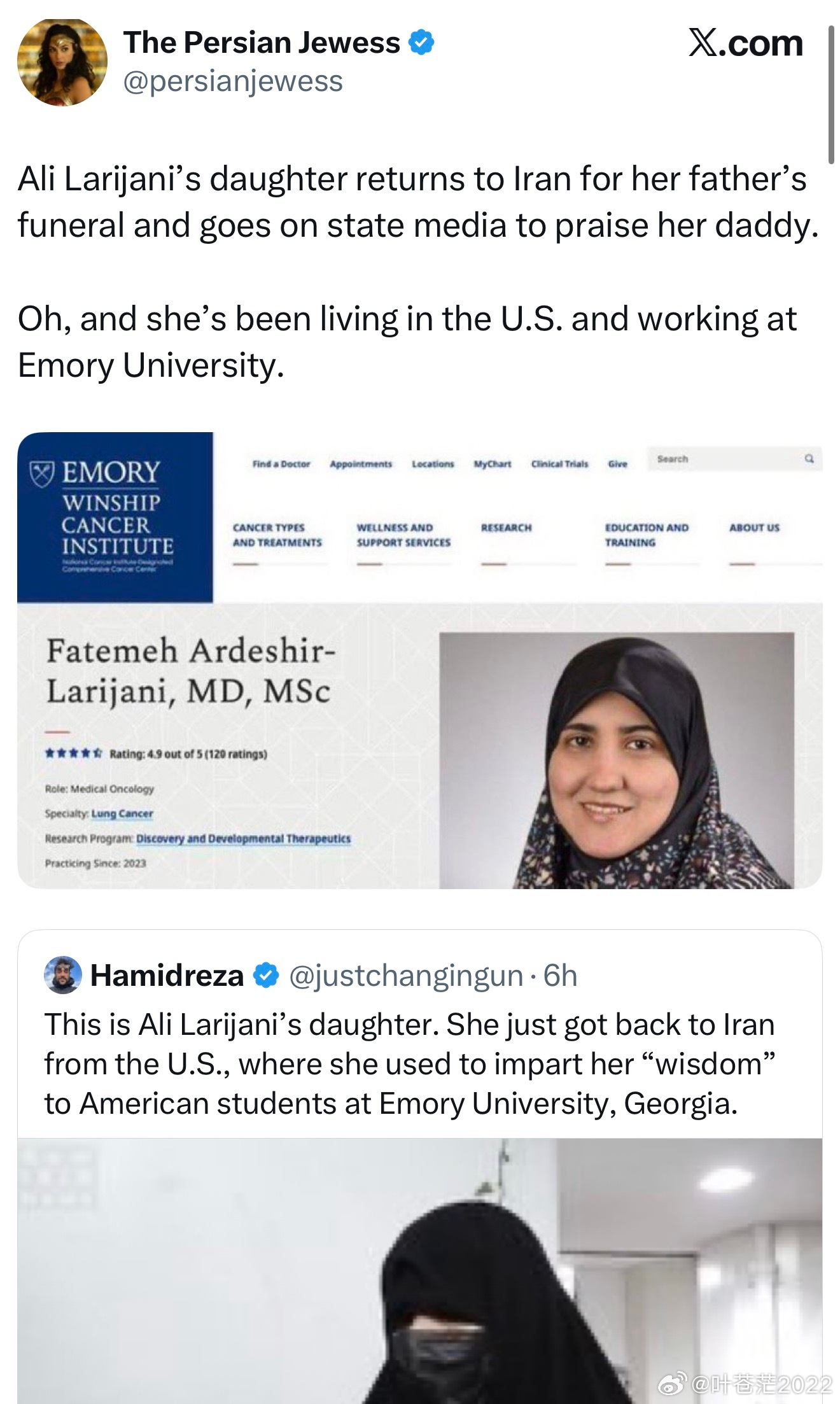 阿里·拉里贾尼的女儿回到伊朗参加父亲的葬礼,并在官方媒体上公开赞颂她的父亲。噢,