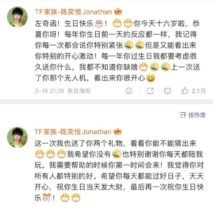 陈奕恒给左奇函的生日祝福,特别好特别真诚!