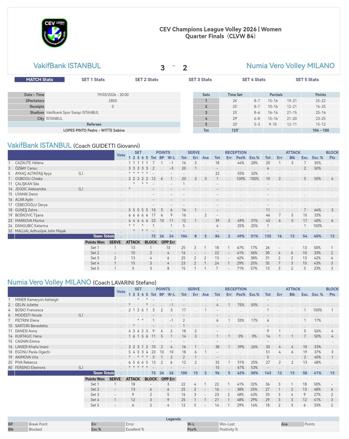 瓦基弗银行拿到欧冠最后一个名额 2025-2026女排欧冠四分之一决赛次回合,瓦基弗银行主场3-2战胜米兰,场分2-0对手拿到最后一个四强名额,比分25-22, 16-25, 25-16, 23-25, 15-12。马尔科娃、埃格努并列得分王,博什科维奇MVP。半决赛,瓦基弗银行将对阵科内利亚诺。 瓦基弗银行: 马尔科娃43扣17中6失5被拦、6拦0发23分 博什科维奇46扣15中7失5被拦、0拦2发17分 奥格博古10扣5中2失0被拦、4拦3发12分 居内什11扣7中0失0被拦、3拦0发10分 卡佐特20扣7中1失3被拦、0拦0发7分 厄兹巴伊4扣2中0失0被拦、0拦0发2分 丹古比奇1扣1中0失0被拦、0拦0发1分 米兰: 埃格努51扣19中4失6被拦、3拦1发23分 皮瓦27扣13中2失2被拦、0拦0发13分 库尔塔吉奇14扣7中1失1被拦、4拦0发11分 拉尼尔30扣10中4失4被拦、0拦0发10分 达内西9扣5中1失0被拦、4拦0发9分 博西奥1扣1中0失0被拦、1拦1发3分 阿基莫娃5扣2中0失0被拦、1拦0发3分 皮特里尼6扣1中0失0被拦、0拦0发1分 瓦基弗银行-米兰: 扣球得分:54-58 拦网得分:13-13 发球得分:5-2 对方送分:32-27 总得分:104-100 一传到位率:49%-42% 一传完美率:31%-30%