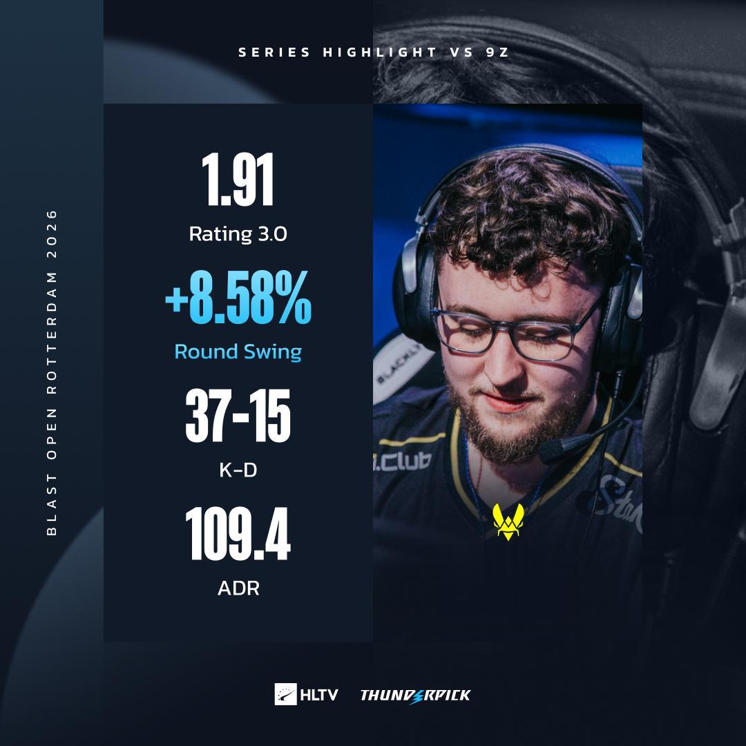 虎扑03月20日讯在刚刚结束的BLAST鹿特丹小组赛,Vitality对阵9z的系列赛中,ZywOo打出统治级表现。他全场拿下1.91Rating、37-15的KD、109.4的ADR以及+8.58%的RoundSwing的恐怖数据,毫无争议地斩获系列赛MVP,率队取胜。