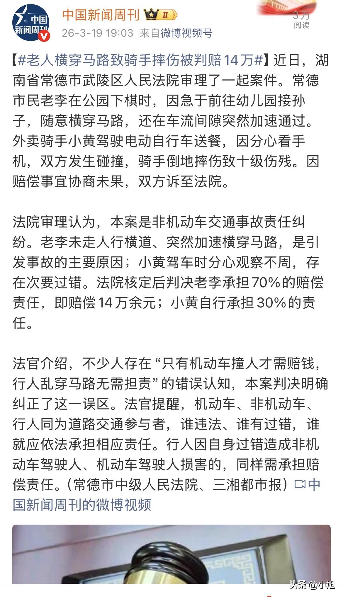2024年10月,湖南常德,一个再普通不过的下午,公园的石桌旁,老李的棋局正杀到难解难分处。他手捏一枚棋子,盯着棋盘琢磨,旁边有人多嘴提了一句,快四点了,该接孙子了。老李这才猛一抬头,坏了,光顾着下棋,把正事忘了。他看一眼表,四点了,孙子四点十分放学,从这里走到幼儿园,紧赶慢赶也得七八分钟,晚了,肯定晚了。 老李心里火烧火燎的,孙子要是放学看不见爷爷,肯定站在门口哭。他脑子里全是孩子抹眼泪的样子,越想越急,抓起搭在石凳上的外套,转身就走。从公园门口到马路对面的人行横道,少说两百米,走过去得两分多钟,他等不了。他看准了马路中间的护栏有个缺口,不少人从那穿过,心一横,径直走了过去。 站在双黄线边上,老李盯着来来往往的车,等着机会。左边过去一辆,右边跟上来一辆,他夹在中间,身子绷得紧紧的,眼睛死盯着车的空隙。就在右边那辆车刚过去,后面出现一个空当的瞬间,他抓住这个机会,突然加快步子,几乎是跑着往对面冲。他心想,就这几步,跑过去就踏实了,接孙子肯定来得及。 小黄那时候正骑着电动车顺着这条路走,手机架在车把上,屏幕亮着,随时刷新订单。他二十出头,干外卖这行时间不长,每一分钟都跟收入挂钩。他刚送完一单,正低头扫一眼屏幕,看看附近有没有顺路的新单子,就那一两秒钟,等他再抬起头,一个人影突然蹿到跟前,近得他连刹车都来不及细想。 小黄本能地双手猛捏刹车,电动车后轮一下子抱死,整个车横着甩出去。他身体失控,从车上重重摔下来,滑出去好几米远,马路上的石子蹭得他皮开肉绽。电动车摔得稀烂,塑料壳子碎了一地,餐箱里的外卖洒得到处都是,汤汤水水流了一片。 老李站在马路中间,整个人傻了。他没想到自己这一跑,能把人撞成这样。周围有人围过来,有人打120,有人报警。小黄躺在地上动不了,脸疼得发白,咬着牙不出声。老李站在旁边,手不知道往哪放,想上去扶又不敢,嘴里念叨着,我急着接孙子,我急着接孙子。 到了医院一检查,小黄的伤比想象中重得多,右腿骨折,还有别的地方伤得不轻。最后司法鉴定出来,十级伤残。他才二十出头,腿落下毛病,以后好多活都干不了,这辈子的事都难说。老李听说这个结果,心里也沉了一下,但他还是想,我是被撞的那个,怎么还要我赔钱? 交警调了监控,责任划得清清楚楚。老李横穿马路,没走人行横道,还在车辆临近时突然加速,负主要责任。小黄骑电动车看手机,观察不到位,负次要责任。老李不服气,觉得行人横穿马路的人多了,怎么偏他出事就赔钱?可法律条文写得明明白白,《道路交通安全法》第七十六条,非机动车驾驶人、行人有过错的,根据过错程度承担责任。《民法典》第一千一百六十五条也说,行为人因过错侵害他人民事权益,应当承担侵权责任。 双方协商赔偿的时候,老李才知道这事有多大。小黄那边列出来的费用单子,住院费、后续治疗费、误工费、残疾赔偿金、护理费,七七八八加起来,总共209489.6元。老李听得心里发颤,这笔钱对他来说,不是小数。谈了几次都谈不拢,最后只能上法院。 法院把账一笔笔算清,老李承担70%的赔偿责任,146642.72元,取个整14万多。小黄自己承担剩下的30%。法官宣判的时候,老李站在那里,脸色难看极了。他那天下午在公园下的那盘棋,最后输了14万。他心想,如果当时多走两步,走人行横道,如果过马路的时候不那么着急跑那几步,如果……可惜没有如果。 小黄拿到判决书,心里也说不清是什么滋味。钱是判下来了,可他的腿伤,他这辈子受的罪,不是钱能补回来的。他才二十出头,往后找工作,找对象,人家一看他走路不利索,十级伤残,心里都会掂量掂量。那一眼手机,他付出的代价太大了。 这个案子判完之后,法官专门出来说了几句话。很多人一直有个错觉,以为只有机动车撞人才赔钱,行人乱穿马路撞了白撞,不用负责。这回法院把这话说透了,机动车、非机动车、行人,都是道路交通参与者,谁违法谁有过错,谁就得依法担责。行人把人撞伤了,一样得赔。这种判决,保护的不仅是受害人的权益,也是在告诉所有人,马路上没有谁可以例外。 老李接孙子的那点事,接出了14万的代价。小黄看手机的那一眼,看出了一个十级伤残。两个人,一个急,一个分神,在这个路口撞上了。事后老李肯定想过无数次,如果那天下午不下那盘棋,如果早点走,如果走人行横道,如果过马路不那么急跑,如果……小黄肯定也想过,如果那天下午不低头看那一眼手机,如果早一点抬头,如果能刹住车,如果…… 马路上没有如果,只有结果和后果。 (来源:综合常德市中级人民法院、三湘都市报、华声在线、常德日报)