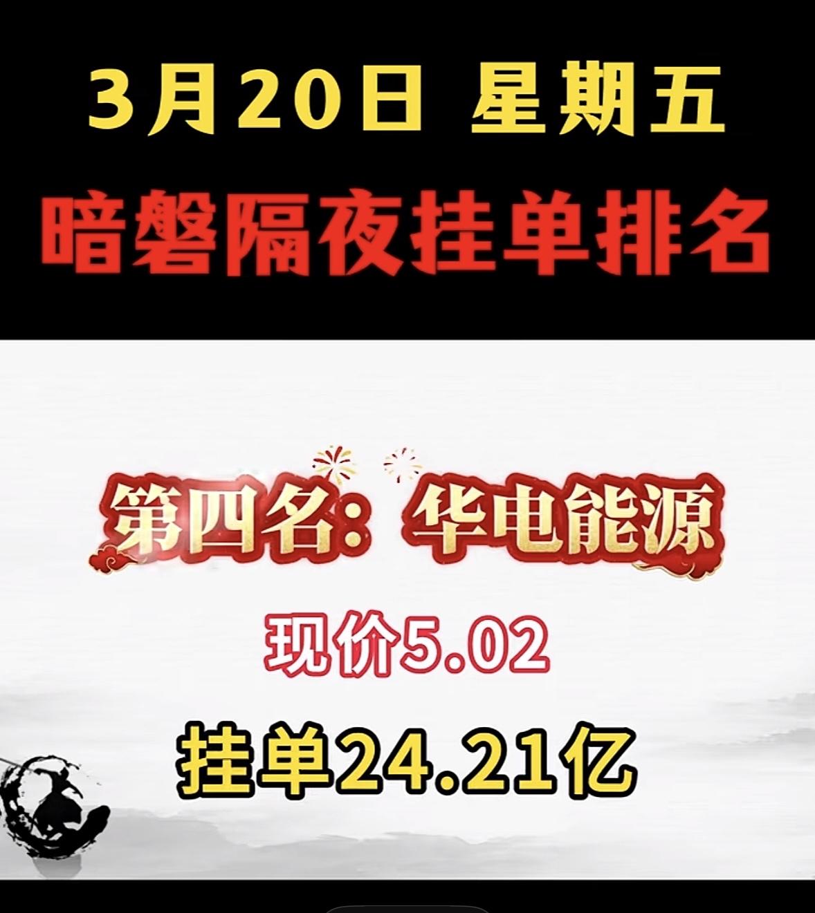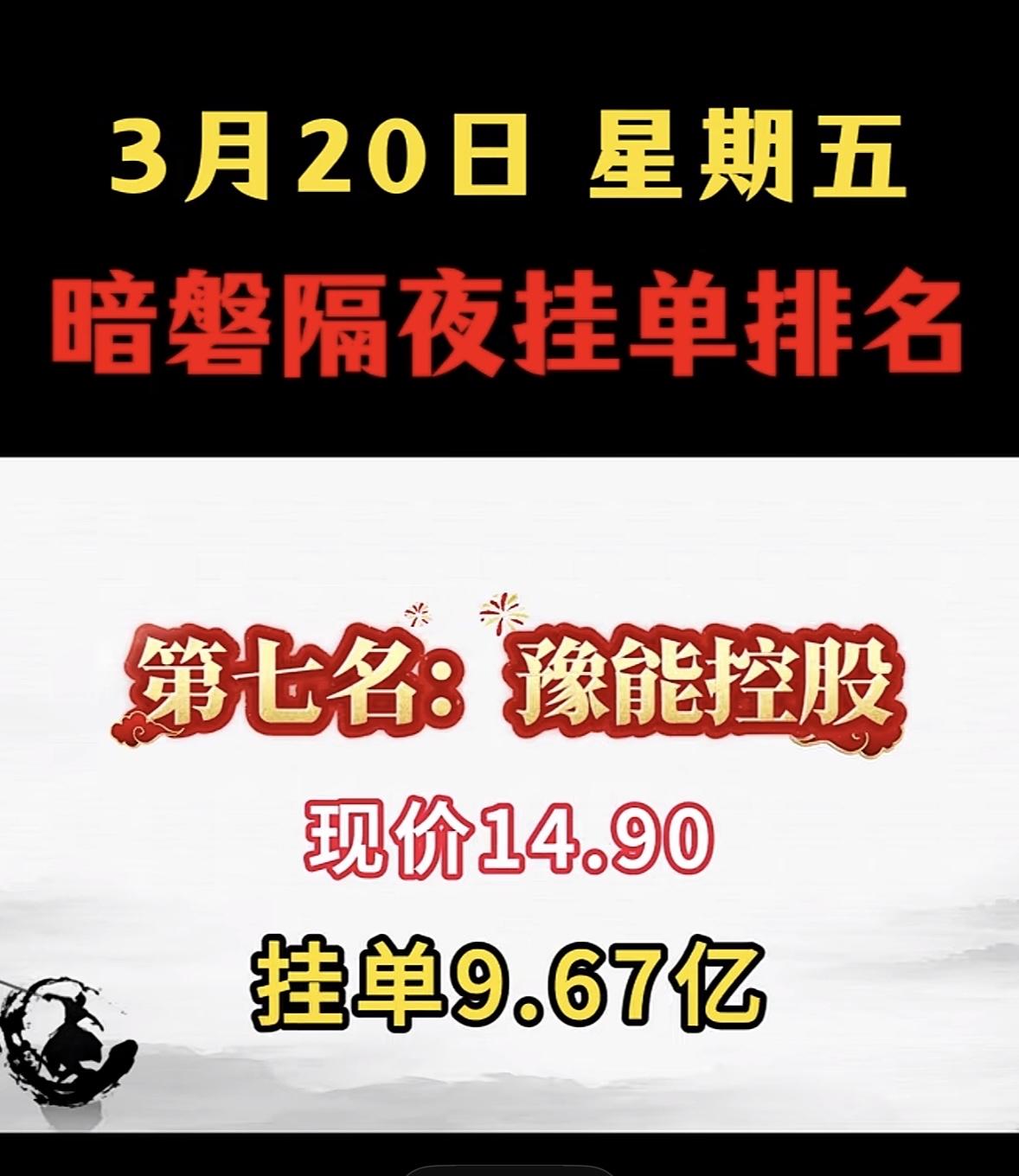 3月20日暗盘隔夜挂单排行榜出炉 3月20日暗盘榜里,豫能控股很是惹眼,现价14.90,挂单9.67亿。从历史数据看,2026年3月2日收盘价14.20,涨幅6.45% ,之前几日也有不错涨势。对比3月12日暗盘隔夜挂单的企业,协鑫能科挂单42.88亿、洲际油气挂单53.98亿、协鑫集成挂单61.73亿,豫能控股挂单金额虽没那么高,但也不容小觑。这挂单金额反映市场对它有一定关注度,后续走势值得持续关注,说不定会有新的惊喜或者变数,股民们可得盯紧咯。
