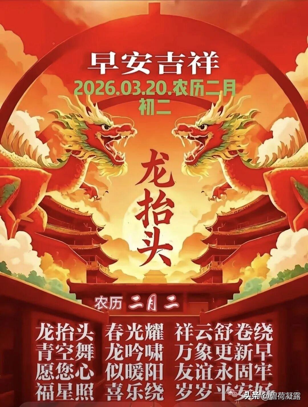 今天是3月20日,农历二月初二,吉祥美好的一天,春分遇龙抬头,双节同喜,双倍好运,春分之日,恰逢龙抬头,春分到,龙抬头,愿抬头见喜,万事顺遂,福气满满,好运常伴,双龙迎春,春分送暖,愿你岁岁平安,事事顺心!愿你平安喜乐,笑口常开,每一个平凡日子都能绽放出不凡的光彩!