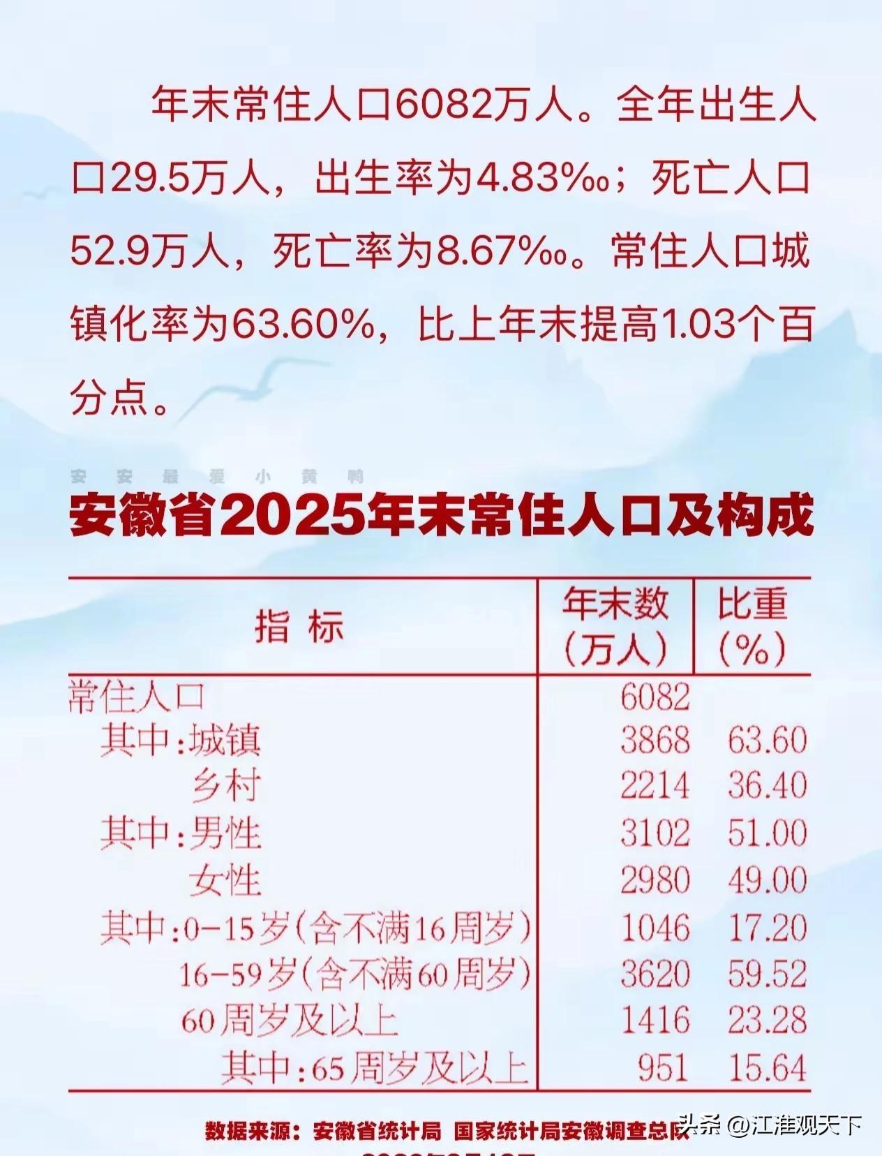 湖北和安徽的人口差距是271万人了,从1000万差距缩小到300万以下 湖北和安徽同属中部崛起战略里,也就是中部六省范围之内,同时两省又是邻居省,湖北按照地理位置属于华中地区,安徽按照地理位置属于华东地区。 湖北省有6个邻居省市,分别是:重庆,湖南,江西,安徽,河南,陕西。 根据湖北和安徽两省官方统计局给出的数据,2025年末湖北省常住人口5811万人,安徽省常住人口6082万人,湖北比安徽人口还差271万人。 湖北户籍人口6112万人,安徽户籍人口7112万人。 户籍人口对比常住人口,湖北省减少了301万人。 安徽省户籍人口对比常住人口,减少了1030万人。 综合对比,湖北比安徽人口流失率低,安徽省人口流失率更高。人口数量分布图 湖北城市对比 中国人口地图 武汉人口差异 湖北文化差异 安徽人口流动 湖北经济总量