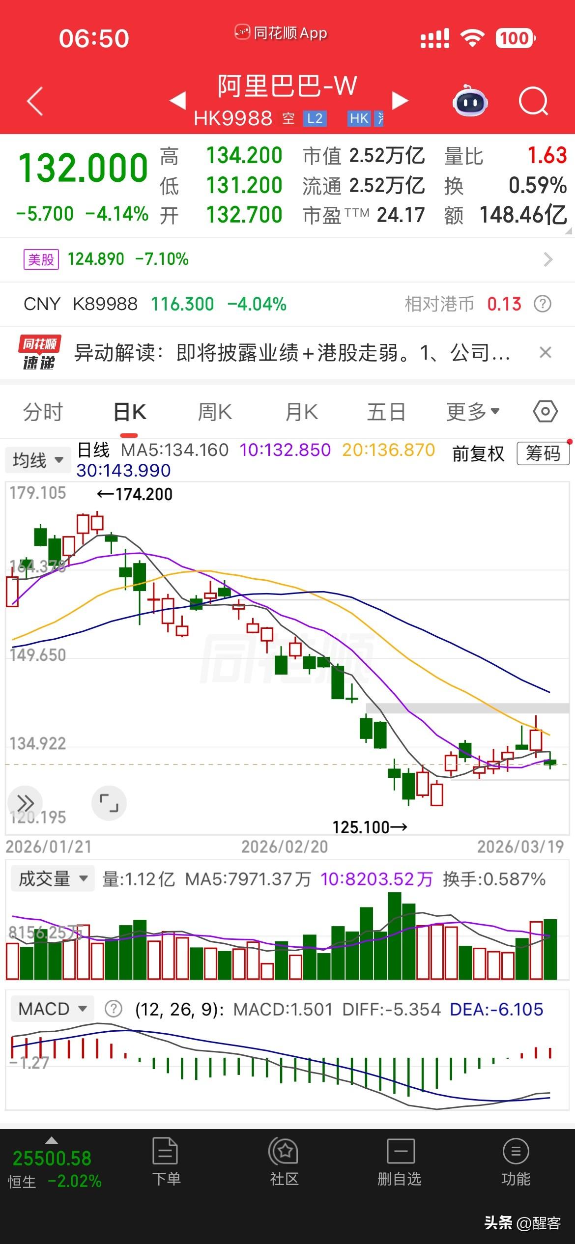 阿里巴巴美股大跌超7%,美股市盈率降至16.92。 而今天港股同样会大跌至少8%
