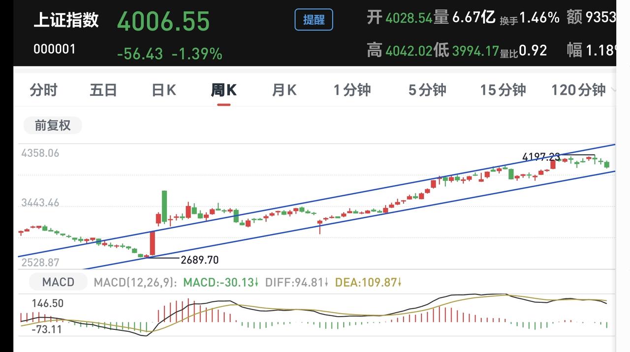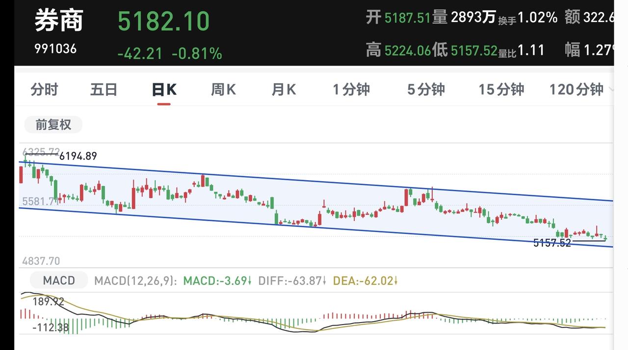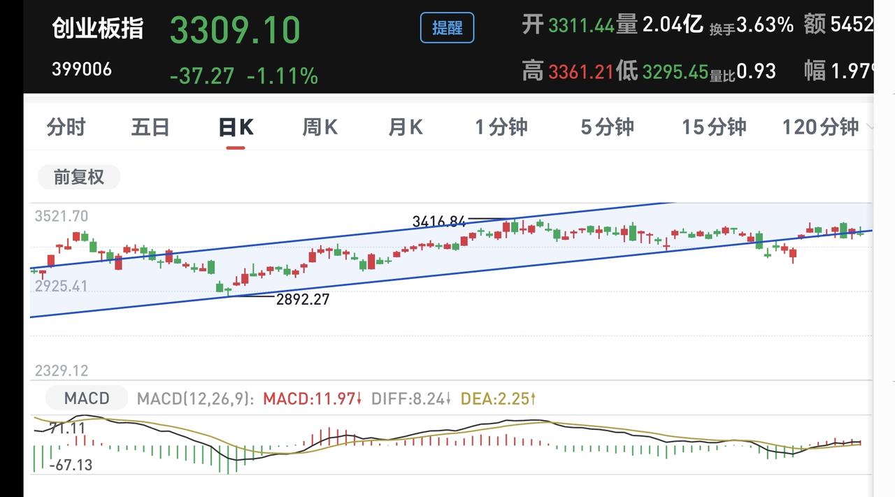 基金:市场什么时候才会有真正的机会 市场昨天全线下跌,三大指数都是下跌,股票接近5000家下跌,主力资金净流出超过了1000亿,这个时候,有人认为是风险,有人认为是机会,当市场存在分歧的时候,通常都不是机会,让大多数人都不看好后市的时候,真正的机会才会到来。 看下面的截图1,这是上证指数日K线图,日线级别跌破上涨趋势线以后,形成了一个新的短期下跌通道,今天的下跌已经来到了日线级别短期下跌通道下轨线附近,这里大概率会有一个反弹,因为,在下跌通道下轨线附近,反弹的概率是大于继续下跌的概率,这就像在上涨通道上轨线附近,震荡调整的概率也是大于继续上涨的概率,道理是一样的。但是,在突破这个下跌通道上轨线之前,任何的上涨都作为反弹来看,反弹结束以后,大概率还是会继续下跌,就是还是会继续在这个下跌通道内震荡,这个通道内所有的上涨和下跌都是无效波动,只有上涨突破这个下跌通道上轨线的上涨才是有效的上涨。 看下面的截图2,这是上证指数周K线图,今天下跌以后距离上涨通道下轨线比较近,同样的道理,在上涨通道下轨线附近也是上涨的概率比下跌的概率大,这也是我为什么认为这一次的调整空间不会很大的主要原因。 看下面的截图3,这是创业板指日K线图,今天的下跌跌破了日线级别上涨通道的下轨线。近期观察这个破位是不是有效破位,如果是有效破位日线级别上涨通道的下轨线,短线的人需要注意风险。 看下面的截图4,这是创业板指周K线图,这个板块现在还处于周线级别上涨通道中,距离上涨通道的下轨线比较远,所以,如果阶段性调整到来,创业板指的调整空间会大于上证指数的调整空间,而我们持有的基金与创业板指的关联性更大,这也是我为什么现在保持不到四成仓位的主要原因。 看下面的截图5,这是券商板块日K线图,这个板块现在处于日线级别下跌通道中,距离下跌通道的下轨线比较近,这个板块的短线下跌空间已经不大,虽然处于下跌趋势中,但持有的人可以继续持有,我已经把这个板块的基金定投金额,从每天10块钱调整为了每天200块钱。 看下面的截图6,这是券商板块周K线图,这个板块周线级别也是处于下跌通道中,现在的位置已经到了前低附近,这里还是存在一定的支撑的。 脑机接口板块日线级别处于短期下跌通道中,今天的下跌并没有改变这个板块日线级别的下跌趋势,短线想进场的人需要耐心等待上涨突破这个日线级别下跌通道的上轨线,到时候再考虑要不要进场。 脑机接口板块周线级别处于上涨通道中,距离上涨通道的下轨线还有一定的空间,小幅度的下跌都改变不了这个板块周线级别的上涨趋势,长线持有的人可以继续持有。 今天如果有反弹,主要是观察成交量,能不能在成交量的配合,放量幅度在10%之内,都不是有效放量,只有有效放量的上涨,才会有持续性。 花1秒钟点赞,花30秒钟评论,就是对我最大的支持,谢谢大家的支持。