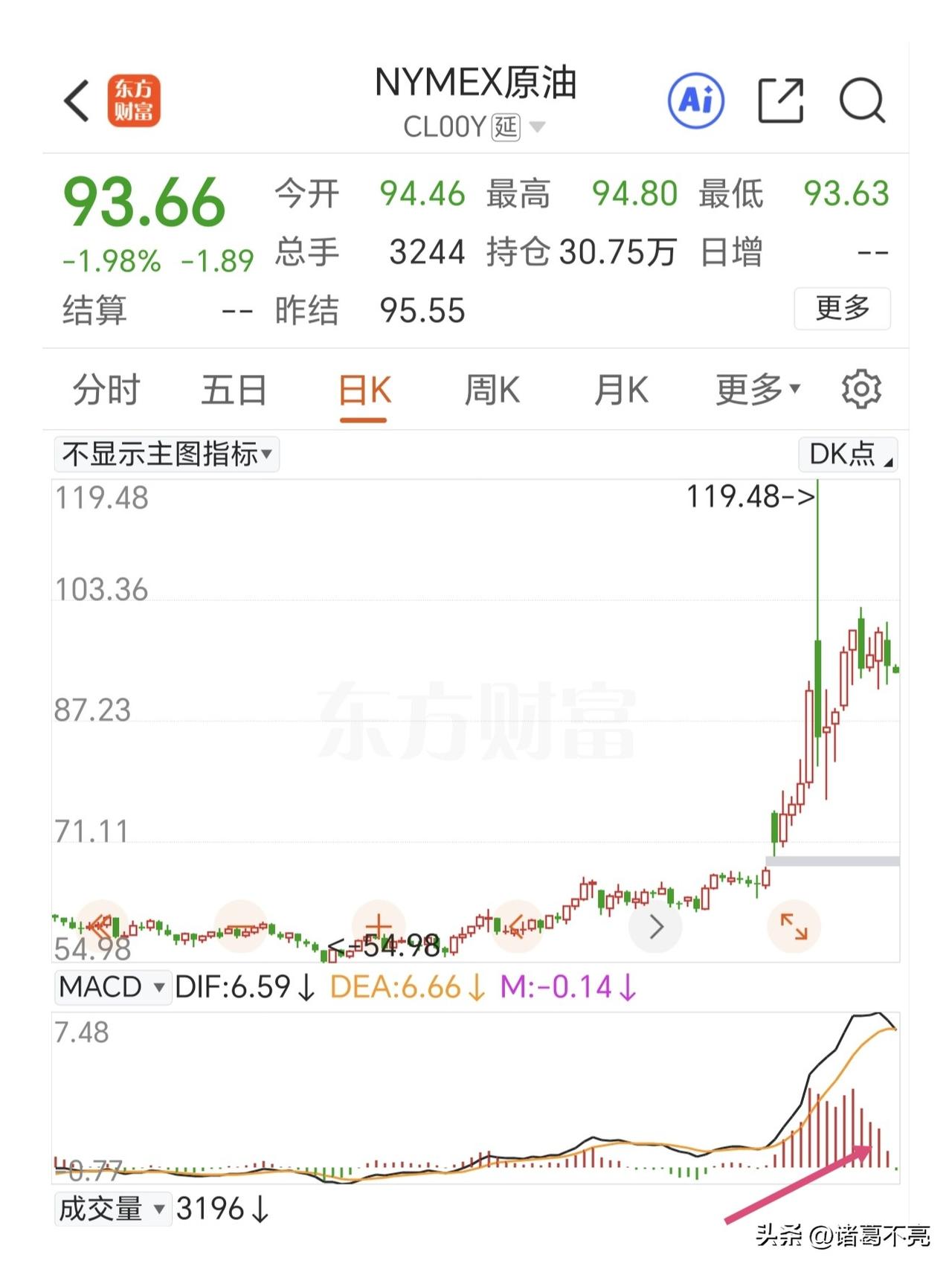 大A到了背水一战的时候,超跌反弹不会缺席! 隔夜最好的消息就是原油期货回落,纽约原油和布油期货在高位开始出现macd死叉绿柱,全球资本市场因为原油大涨调整,也会因为原油回落去反弹。 上证指数也到了关键位置,如果放量跌破4000点收不回来,那就成了双顶,底部就要奔3800点去了。这个位置只适合进攻,不能再任由指数下滑了。昨晚官方也放出维稳的消息,能不能掷地有声就看行动了。 昨天大金融板块已经异动了一波,证券多元金融盘中直线拉升翻红,今天需要再接再厉秀一波肌肉打爆空头。 阳线反包是右侧进场点,等待信号吧[祈祷] 原油市场行情 原油行情解读