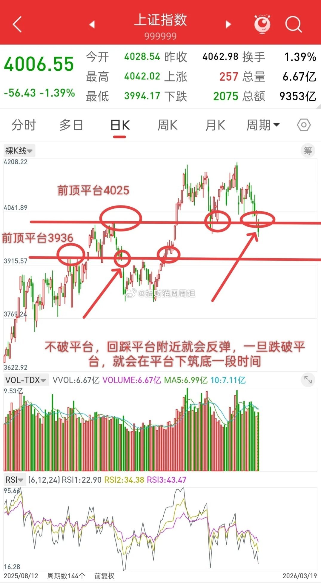 观点和昨晚一致,大盘目前已经跌破前顶平台4025,那前顶平台以上都是套牢盘,前顶不破,行情回踩前顶附近就会反弹,前顶破了,行情就会在前顶下方筑底。