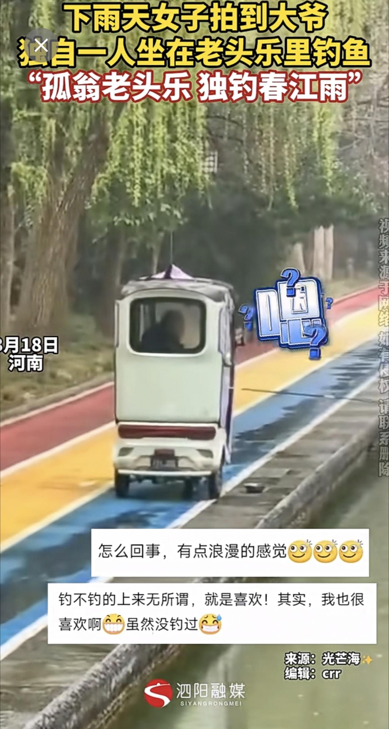 下雨天女子拍到大爷独自一人坐在老头乐里钓鱼“孤翁老头乐 独钓春江雨”(视频来源:光芒海✨)原谅我不厚道的笑了 神操作