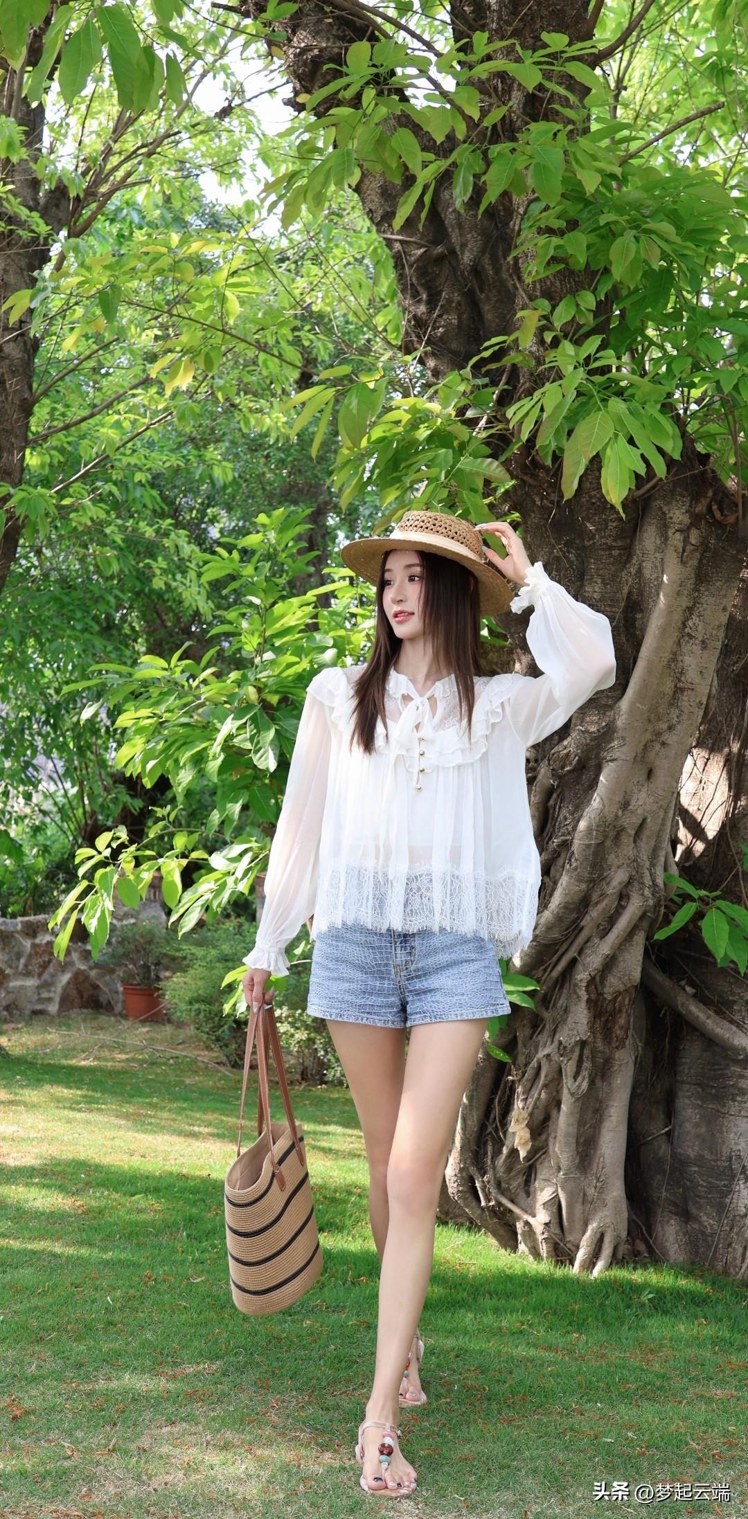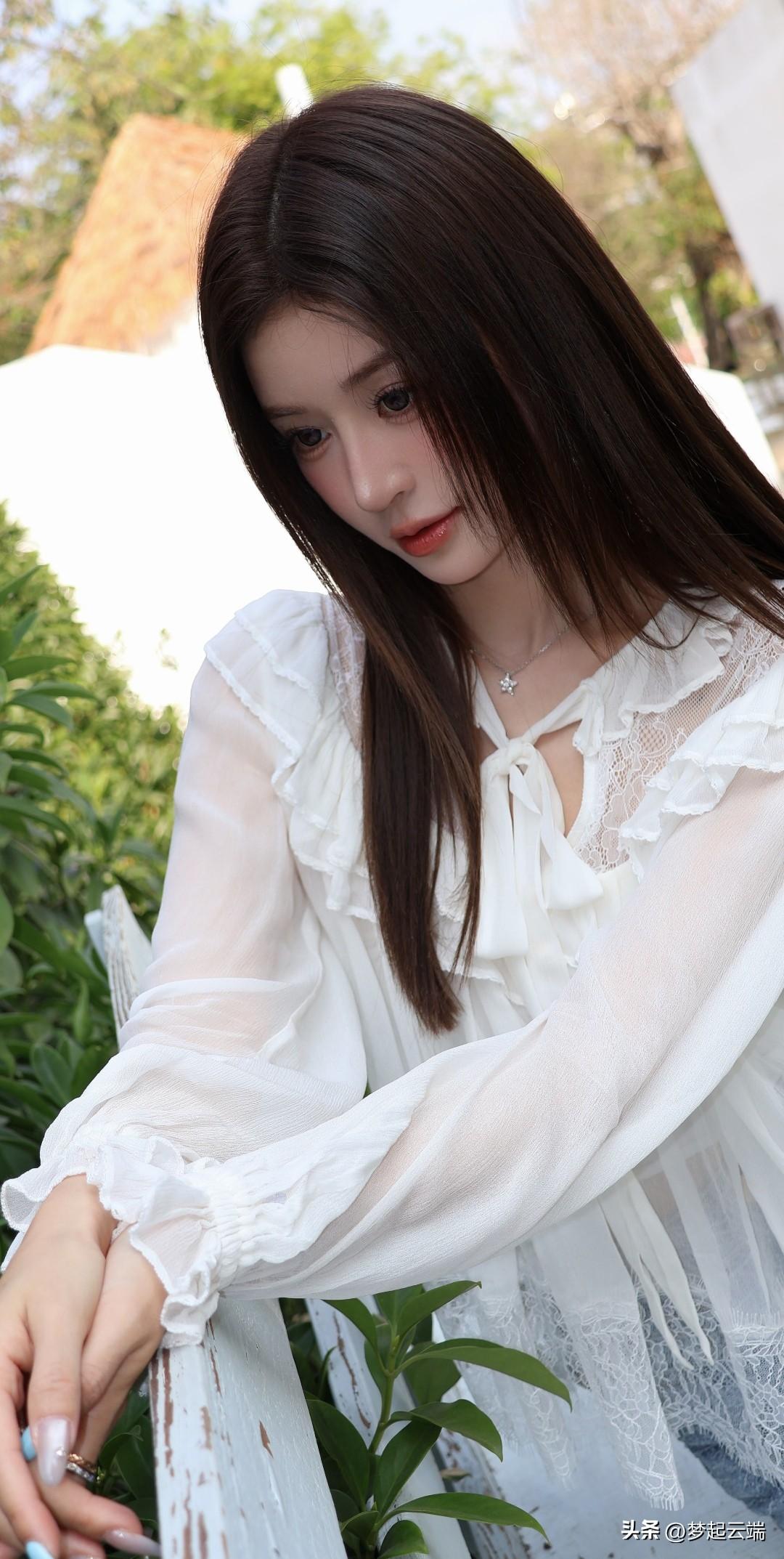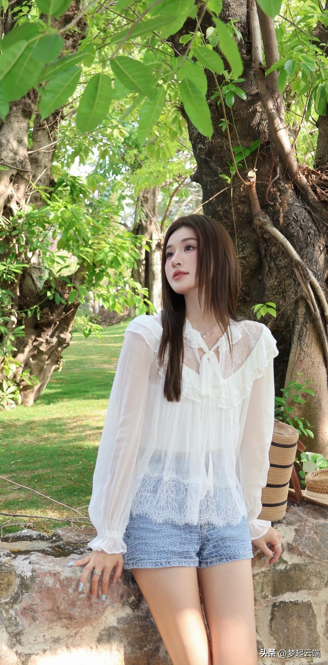 清新自然,少女心满满,白色蕾丝上衣搭配绿色植物,完美融合自然与时尚!🌿💕