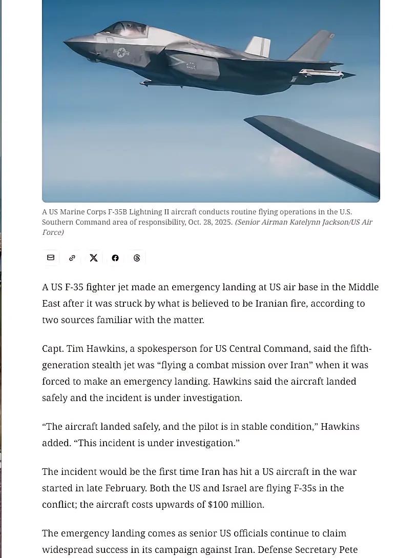 美国神话破灭!美五代战机F35战机被伊朗打中! 当地时间3月19日,当天凌晨2点50分左右,伊朗伊斯兰革命卫队宣布美军一架F-35战斗机在伊朗中部空域遭革命卫队新型先进防空系统击中并严重受损。 革命卫队在声明中称,“极有可能已经坠毁”。此次成功表明伊朗防空系统已实现有效且有针对性的改进。 据美国媒体稍早前援引知情人士消息报道,一架美军F-35战斗机“疑似被伊朗火力击中”,紧急迫降在中东地区的一处美军基地。美军中央司令部发言人称,这架战机当时“正在伊朗上空执行战斗任务”,随后被迫实施紧急迫降,目前已安全降落。 美国这次在中东玩大了或者说也在世界面前把脸丢大了。美国引以为傲f-35空中杀手锏武器,就这样让伊朗给捅下来了。估计美国又懵逼了不知道啥原因。对伊朗开战以来,萨德防空已经是日落西山了,无人机更噼里啪啦的掉,这F-35又给弄下来,说明伊朗打的很顽强,美国的武器也不怎么样嘛!美军的神话在伊朗这里正被一层层揭开面纱,水浅王八出,现了原形。 由此可见,这次对伊朗的战争打的鲁莽且轻率,美国打的吃力被动,对伊朗的战争越来越向长期方向发展。美国军事霸权很可能就在这次对伊朗的侵略战争中彻底坠落!本来打伊朗想展示美国统治力,没想到这次踢到了铁板上,美国军事力量的最后一块遮羞布都给撕碎了!所以对美国来说,伤敌一千自损一千,是举起石头砸了自己的脚!