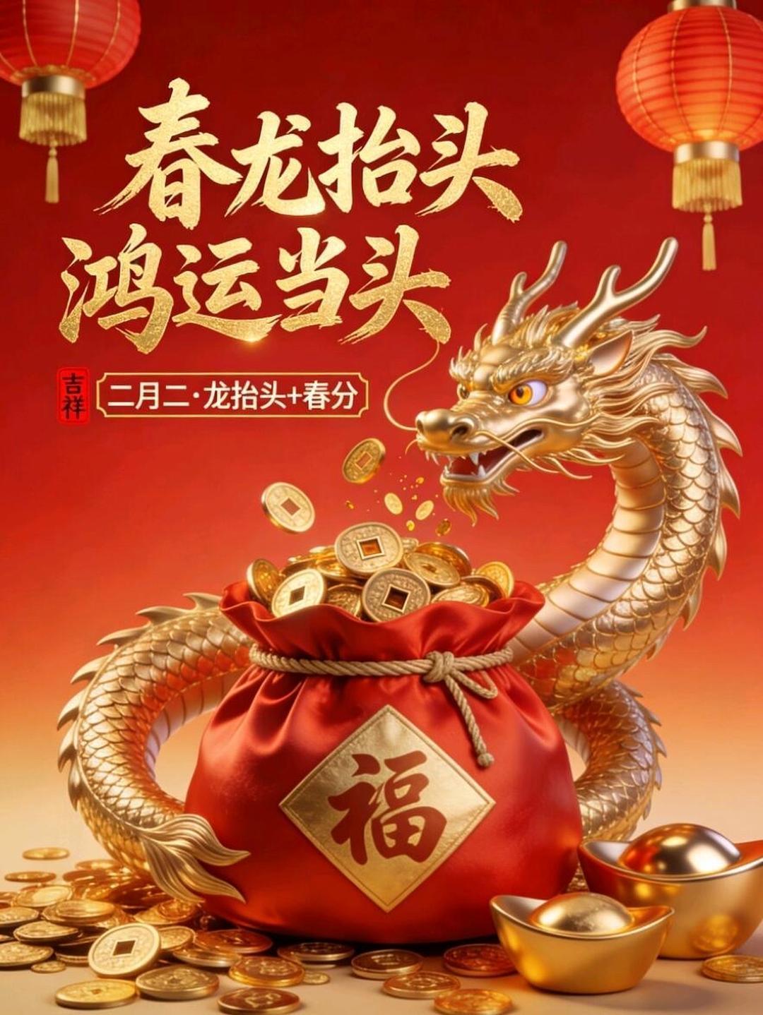 二月二,龙抬头,好兆头,新开头。愿你生活如龙行天下,事业如龙腾四海,家庭和睦幸福,身体康健无忧。烦恼统统抛到脑后头,福气财气都进门里头,岁岁平安,年年有余。传统文化 二月二“龙抬头” 春分 祝福