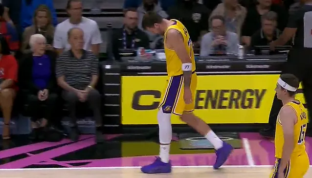 比赛第一节,东契奇回防时被里夫斯绊到失衡倒地,一瘸一拐地走回替补席。