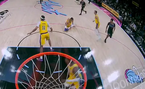 今日NBA常规赛,湖人对阵热火 比赛第一节,东契奇回防时被里夫斯绊到失衡倒地,