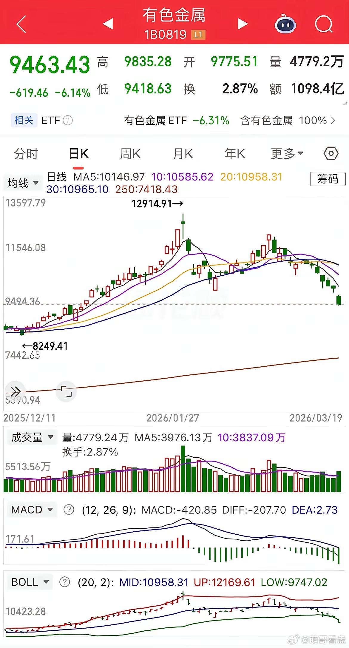 众星捧月的有色金属,近期出现较大幅度调整,跌幅高达21.89%,万万没想到导致整个资源板块下跌的竟然是“它”!3月份以来,资源股连日下跌,似乎没有企稳的迹象,在行业板块中跌幅居前列,代表性的板块有贵金属、有色金属、工业金属、小金属等。以有色金属为例,从3月2日收盘价12115.82点,下跌至今天的9463.43点,跌幅高达21.89%;贵金属板块同期跌幅为21.36%;工业金属跌幅为17.84%;基本上,只要与金属相关的板块都回调了不少,像金属铅、金属锌、金属铜、稀土永磁等概念板块跌幅也基本在20%左右。资源类板块回调,是一个链条式反应,一环扣一环:1. 首先,资源类股票与贵金属是锚定在一起的,也就是黄金,黄金涨,整个资源类板块共振上扬,下跌也是同理的。2. 伦敦金价从年初的4325美元/盎司,一度飙升至5596美元/盎司,涨幅高达29.39%,黄金暴涨是基于美债收益率有下降预期。3. 根据美国的劳工数据,当前失业率稳定在4.4%,其次是美国通胀指标CPI稳定在2.4%,在如此漂亮的数据之下,市场普遍看好美联储降息预期在升高。4. 美联储一旦降息(当前联邦基金利率3.50%~3.75%),美债收益率随之下降,国际大资本投资美债躺赚的局面便不复存在,所以资金纷纷流向黄金市场,黄金因此涨得一发不可收拾。5. 3月28日后,由于中东局势紧张,布伦特原油价格从70美元/桶拉升至最高的112美元/桶,原油价格上涨直接导致美元通胀压力剧增。思维导图就是:中东局势➡️原油上涨➡️各行业成本上升➡️美元通胀➡️降息落空➡️美债吸引力仍在➡️投资黄金的大资本辗转至美债简单来说,中东局势导致美联储降息预期延后甚至是落空,资金更倾向于美债,故而黄金短暂下跌,导致有色金属共振下跌。