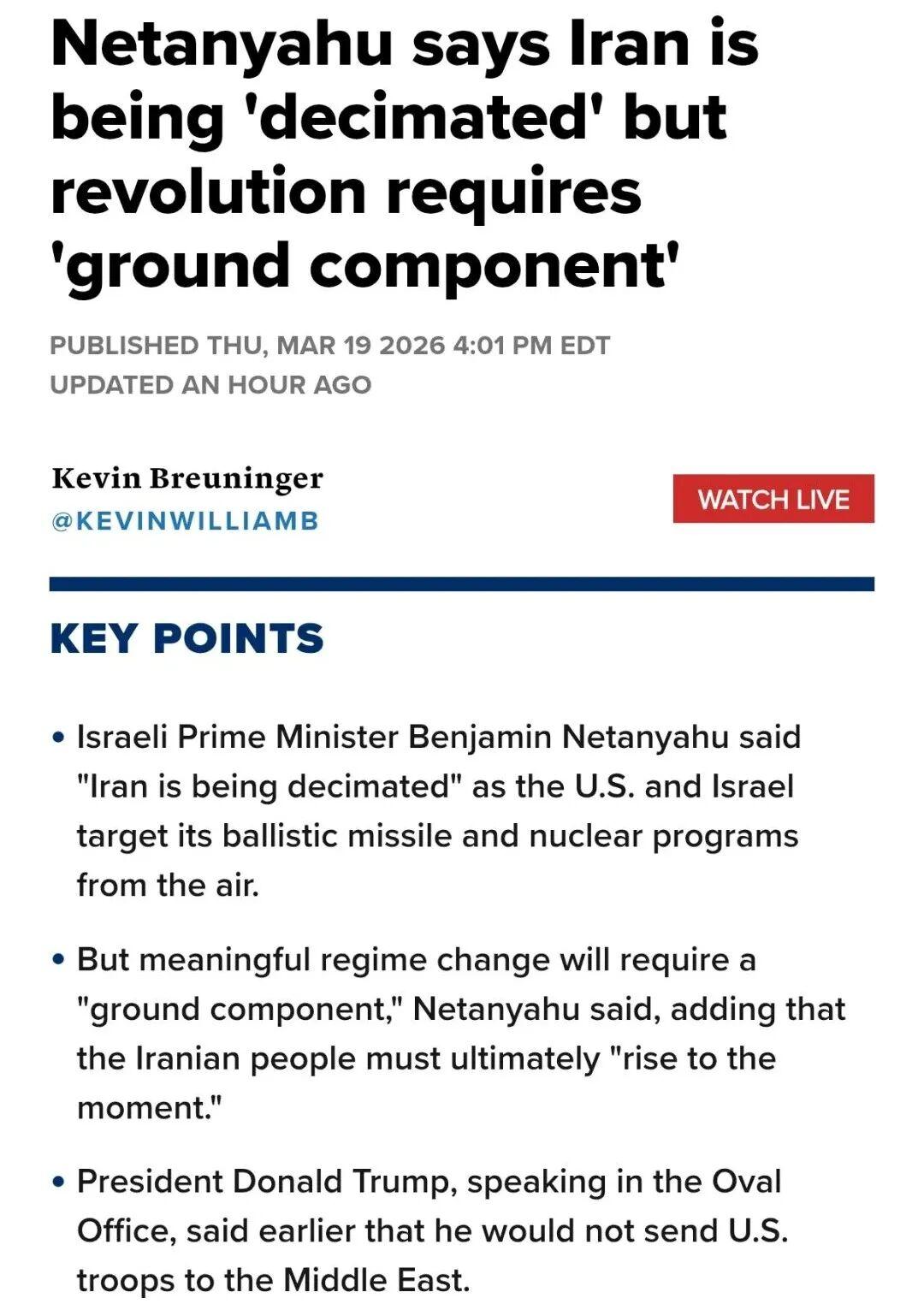 F-35被击中?美“败局已定”,内塔尼亚胡太着急,要求美出动地面部队! 新华社消息,伊朗学生通讯社报道,当天凌晨2时50分左右,伊朗伊斯兰革命卫队新型先进防空系统在伊朗空域击中一架美军的F-35战机。美国有线电视新闻网也报道称,美军一架F-35战机在伊朗上空被击中,然后在中东一个军事基地紧急降落。美军中央司令部发言人蒂姆·霍金斯也证实了这个消息,称这架F-35隐身战机在伊朗上空执行作战任务时遇到麻烦,最终被迫紧急降落。 美军发言人没有证实这架F-35被击中情况,但是却承认遭遇严重意外,专家分析这架飞机大概率是被伊朗击中。对于伊朗而言,尽管这架F-35没有被击落,但只要能击中,就是对美隐身战机的极大威胁。特朗普此前一直宣称摧毁了伊朗防空系统,现在伊朗用行动打脸特朗普,也是告诉美军,伊朗还具备击落美以隐身战机的能力。 这种能力本身就是巨大威慑,下一次美以F-35战机再进入伊朗领空必然会担忧伊朗防空火力,不敢像先前那样肆无忌惮。对于美国而言现在的局面就是败局已定,战争持续时间越久,美国输的越惨,付出的代价越大。从军事上讲,美军遭遇了三重失败。第一美军在中东军事防御体系彻底被击破,美军多部萨德雷达系统被摧毁,铺路爪雷达也被摧毁,防御体系被撕开一个巨大缺口。 第二,美军航母弱点全面暴露,海上霸权神话破灭。美军林肯号航母连续遭到袭击,甚至还被伊朗无人机击中,尽管没有出现被击沉的情况,但也说明美航母没有宣扬的那么强大。美军福特号航母,更是连续发生厕所大规模堵塞、洗衣房火灾,最终一点作用没有发挥,只能返回港口进行维修。美军2个航母战斗群在这次战争中一点存在感没有,让世界看清其纸老虎本质。 第三美军隐身战机被击中,创造了实战中被击中隐身战机先例,暴露美军空中作战体系虚弱一面。从政治上讲,美国遭遇空前孤立,特朗普高呼支援,但是没有任何一个国家响应,这对于美国而言是绝对的失败。从经济上讲,美国不仅仅直接消耗巨大,而且面临通胀恶化、债务快速增加、内部危机恶化等极端情况,也是绝对的失败。 无论从任何角度讲,美国都是败局已定。不可否认,美以目前在军事上依然处于主动地位,依然能对伊朗高层斩首,依然能轰炸伊朗石油设施,但是他们再多的战术胜利也无法实现彻底掌控伊朗的战略目的,并且持续的消耗对于美国而言就是战略上的绝对失败。看到当前的危机局面,内塔尼亚胡也是十分着急。 内塔尼亚胡毫不掩饰的指出,要想达成颠覆伊朗政权目标,仅仅靠空袭不行,必须采取某种地面行动。内塔尼亚胡强调称,我们已经为伊朗人民创造了良好的推翻政府的条件,需要采取地面行动。Tucker Carlson接连两期节目都反映一个问题,那就是美西方社会内部不管左翼右翼,对以色列的反感已经累积到一个很高的程度了。内塔尼亚胡很着急,尽管他想要针对伊朗的战争永久打下去,死死的耗住美国,但是西方国家忍受已经到极限,所以他急着美军出动地面部队解决问题了。