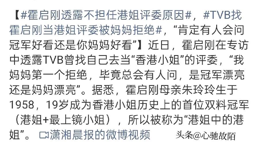 霍启刚,太敢说了! 3月19日霍启刚不当港姐评委,冲上热搜!理由让人笑喷妈妈不让。 TVBicon找他当评委,他挺想去。结果朱玲玲icon第一个站出来拒绝:不行。 理由很简单:肯定有人会问冠军好看还是你妈妈好看。 其实不是这个原因、是怕他沉迷女色误入歧途!人家可是未来香港特首接班人、不想有不好影响!只好找个借口。 玲玲可不一般,她是当年冠军,一九七七年的港姐,她还拿了最上镜奖,她是第一个双料冠军,大家一直记得她,那是港姐中的港姐,这个名号很响亮,她四十七年前的荣耀,让她现在有底气,她的传奇地位,让她很有影响力,她在家里说话,很有分量大家听。 朱玲玲的冠军头衔,不只是她个人荣誉,它也保护了霍家,避开媒体的麻烦,保住家人的声誉,这是很有用的事, 网友表示;这有什么?各花入各眼的问题:牡丹雍容华贵,茉莉幽香泌肺,水仙洁净清高,茶花红似焰火,玫瑰带刺诱人,荷花出自污泥而不染,桂花独占鳌头,都是名花!就看谁的钟爱了! 朱玲玲这理由笑不活了!港姐天花板的底气,儿子当评委这题确实没法答😂 太搞笑了,真想看看他去当评委的样子。不过,他就应该往干实事方面发展,千万别趟娱乐圈浑水。 有人认为人家现在走的是仕途,参加这种活动不合适,只是用幽默的一种方式拒绝。 娱乐圈是个大默缸,任何人进了都会染黑,霍启刚是聪明人,还有一位把门神郭晶晶把关,不去趟混水明智之举。 娱乐圈的水太深,一心走政治路线希望从政的人是不会染指那些事的,香港狗仔队太多使人防不胜防。 霍启刚是最接地气的豪门子弟,爱国敬业,大智慧,大格局,《为人民服务》为宗旨,处事低调,有内涵,时代的楷模,豪门里的一股清流。❤❤👍👍👍