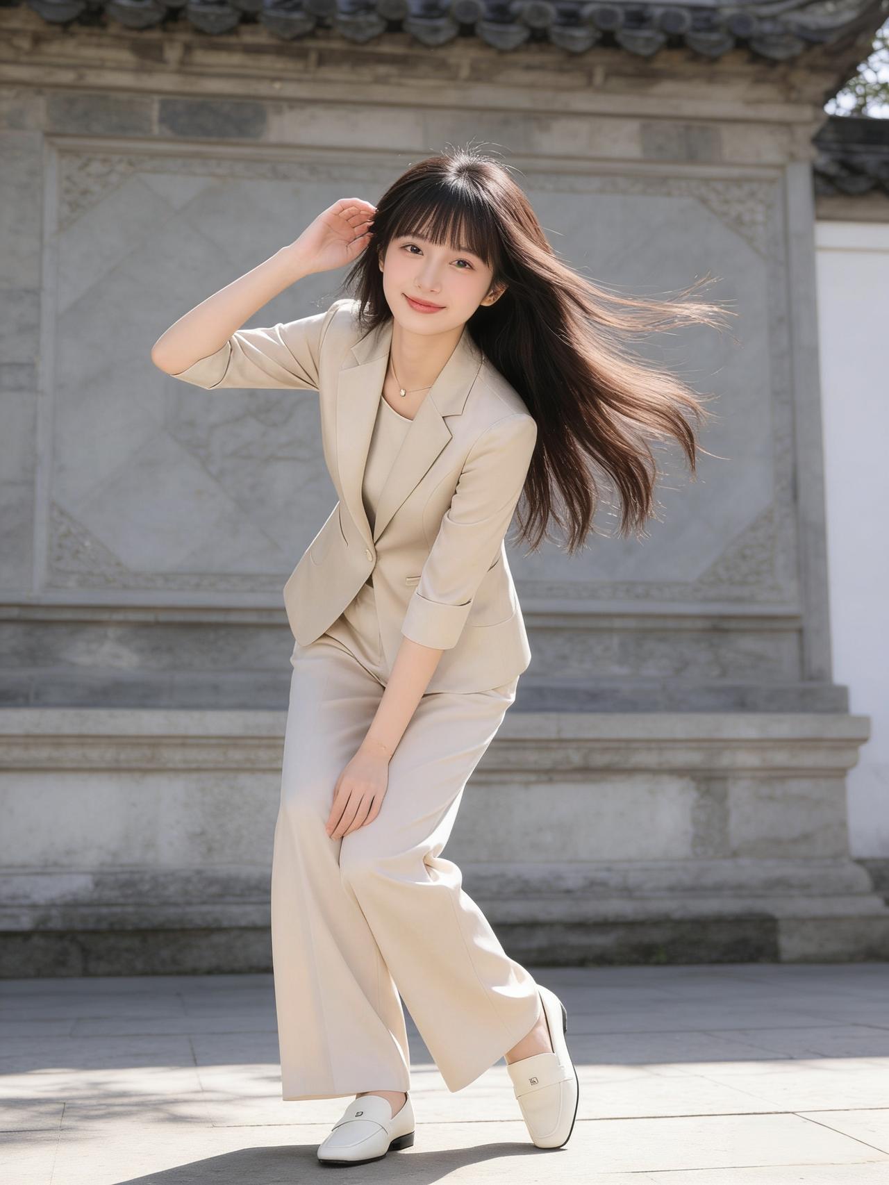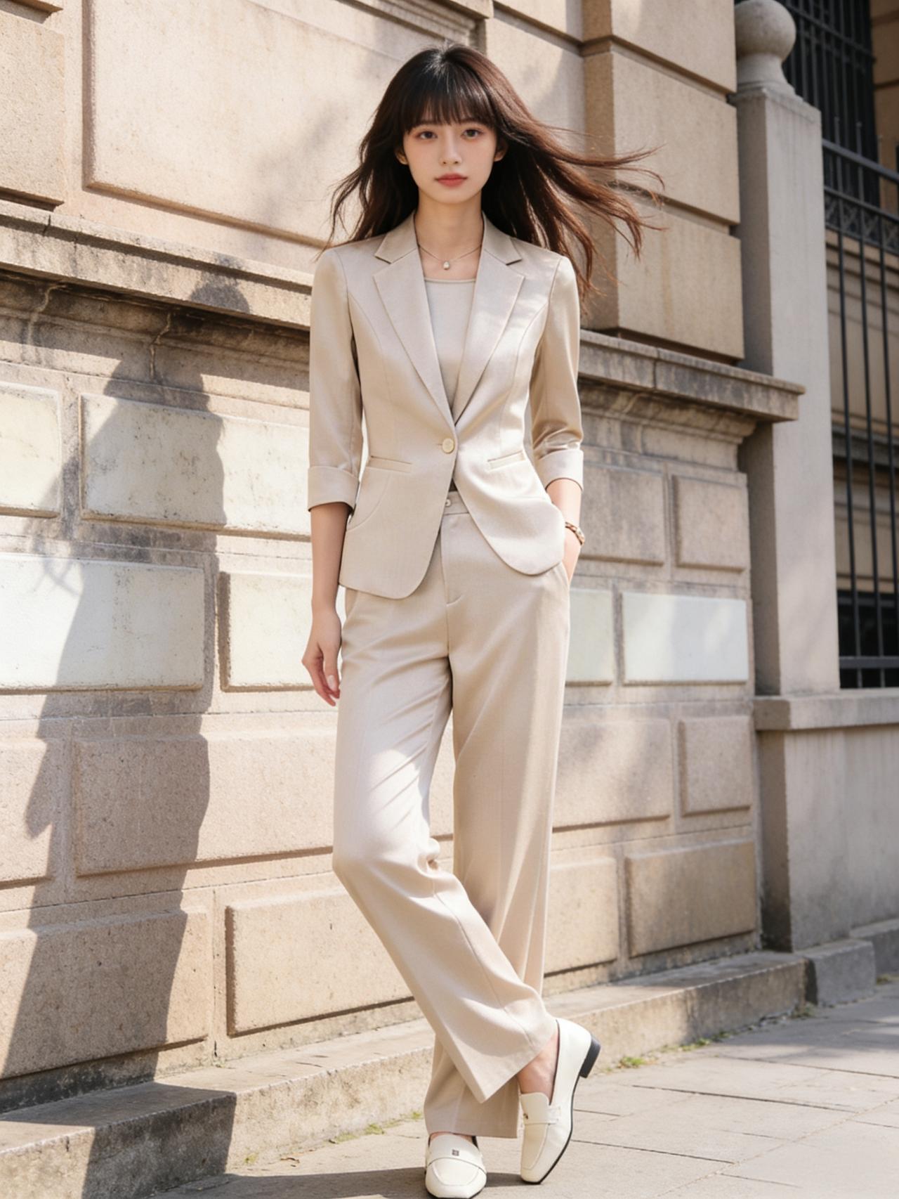 朝霞渐渐铺满天际,淡粉与金红的霞光洒落下来,映得满园繁花愈发明艳。桃树与李树并肩而立,桃花灼灼,艳如红霞,李花皑皑,洁似白雪,桃红李白相互映衬,一浓一淡,一艳一雅,美得恰到好处。 霞光洒在花瓣上,洒在青石路上,也洒在少女的发梢肩头,将整个公园都镀上了一层温柔的光晕,晨露、繁花、朝霞、燕语,凑成了江南三月最动人的景致。 时尚穿搭 职业装
