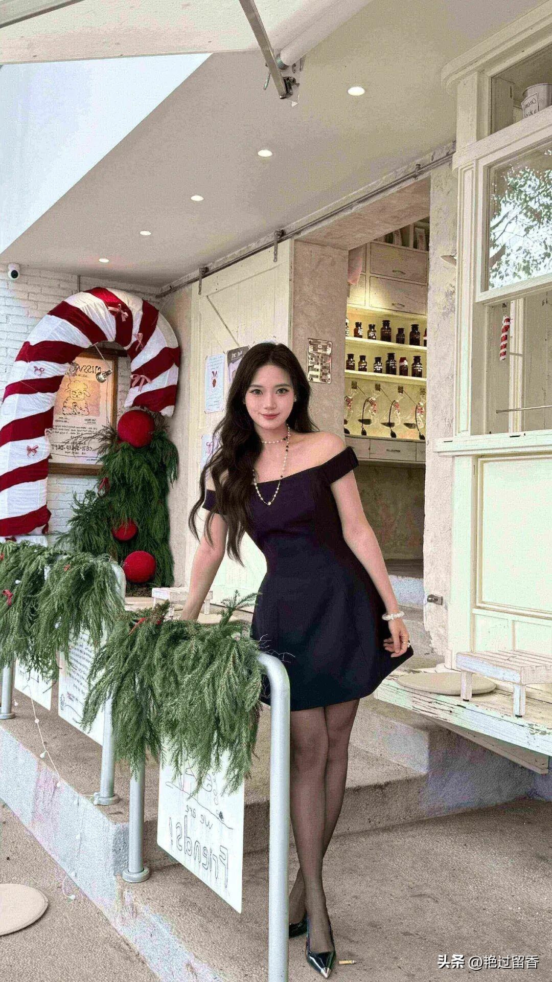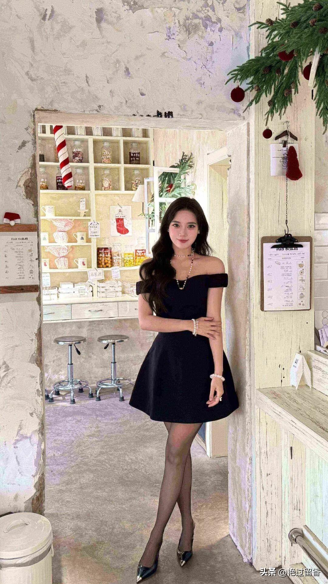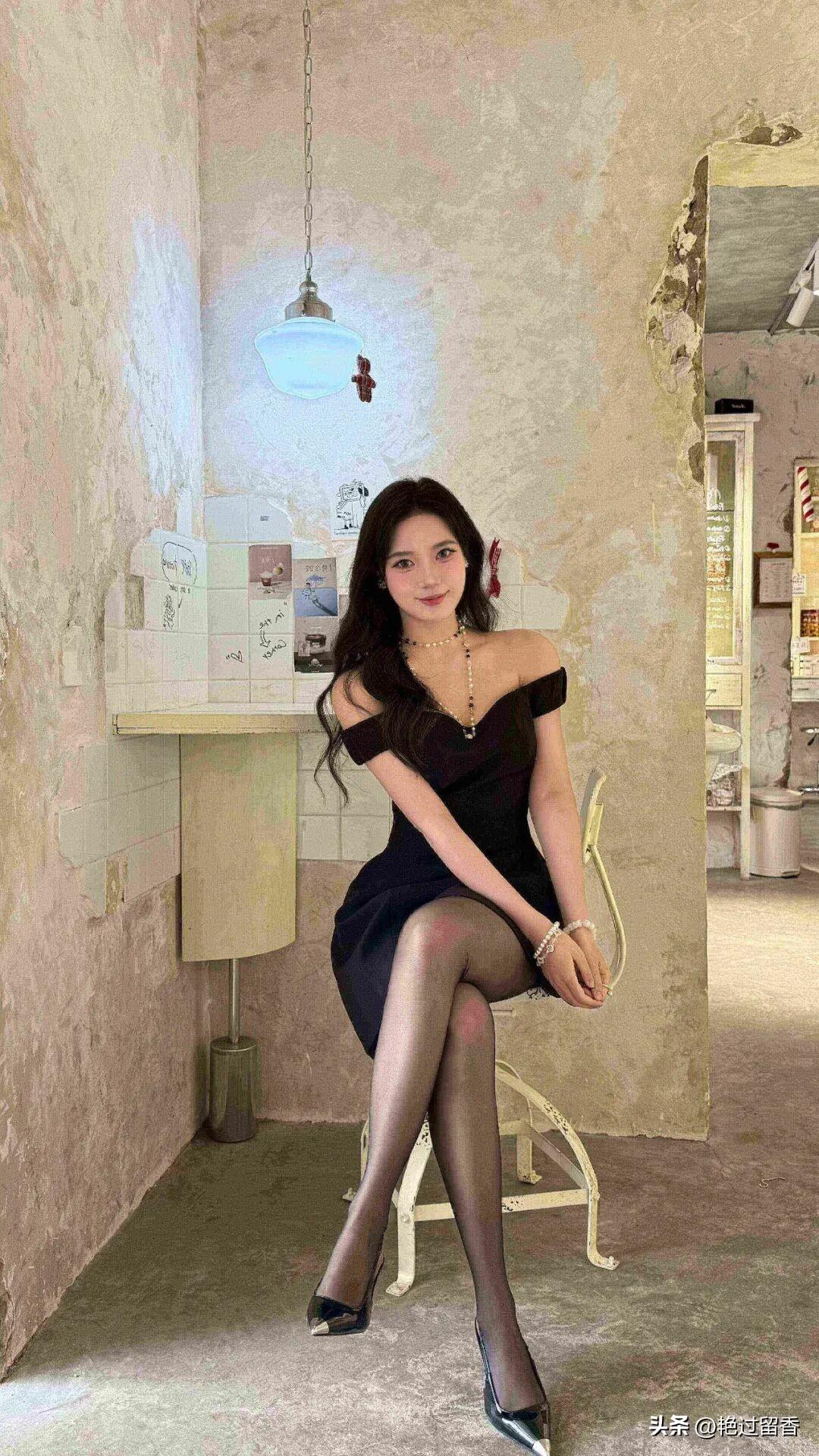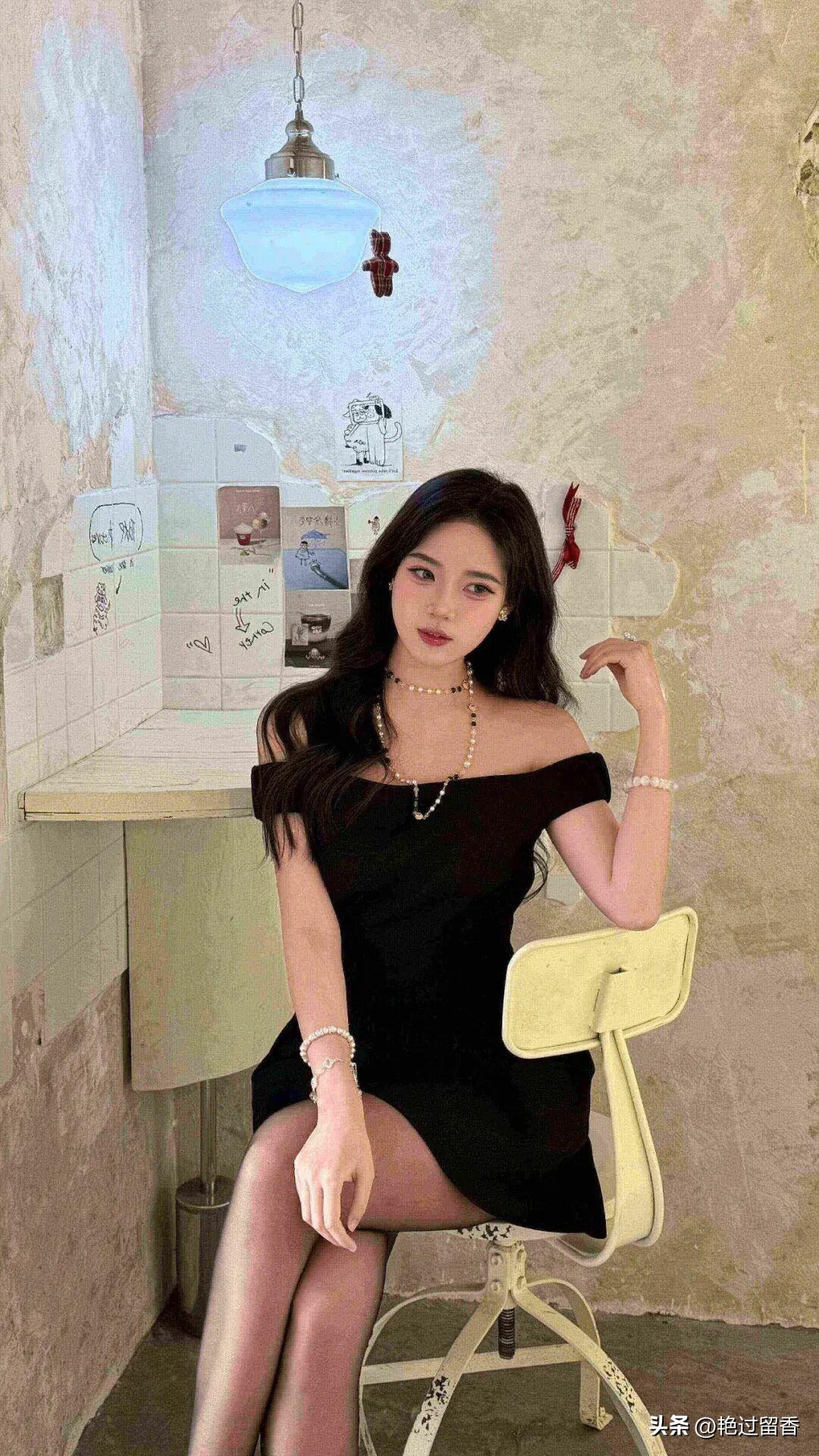 咖啡馆里的甜美少女,黑裙与红白条纹相映成趣,甜美又时尚。
